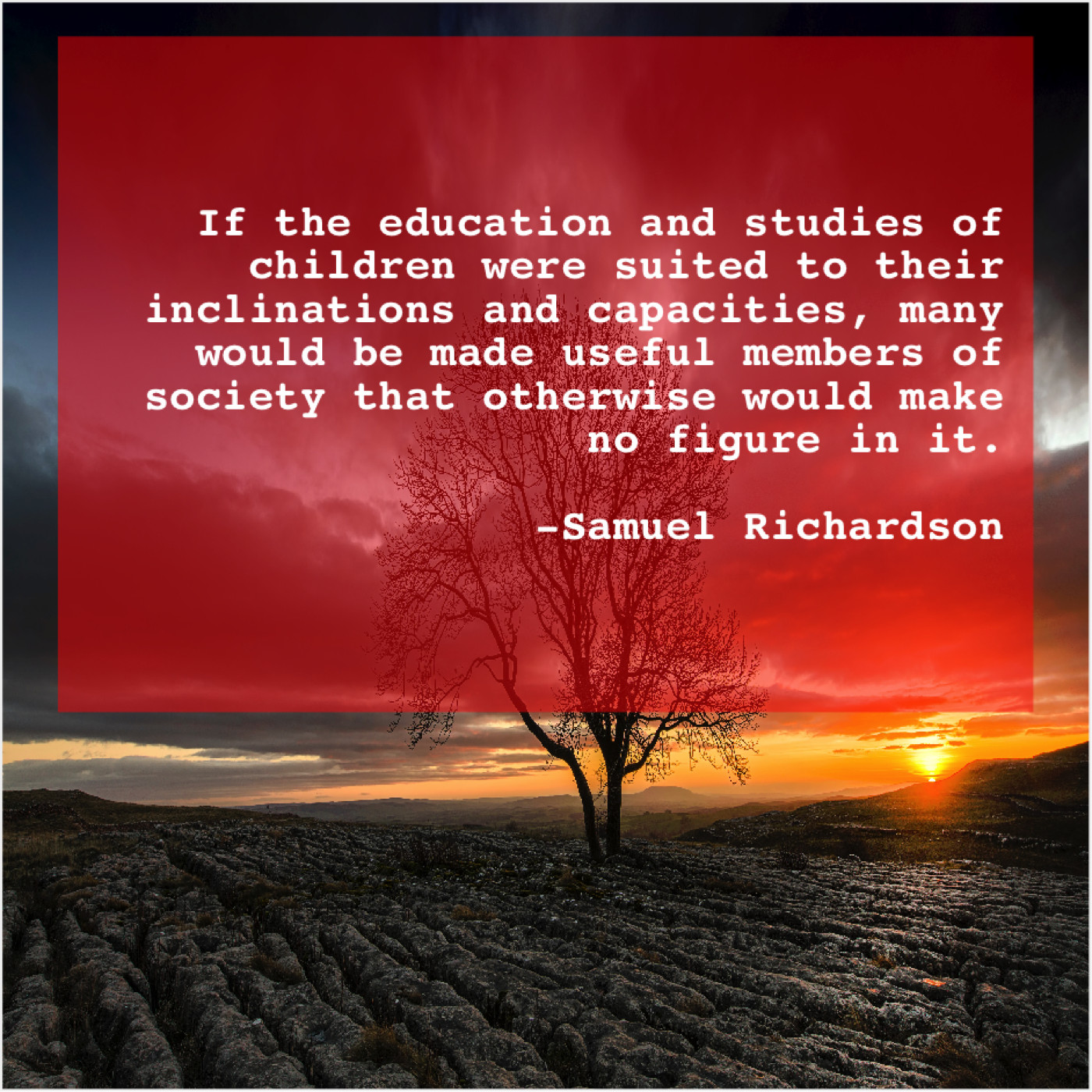 Samuel Richardson Samuel Richardson – If the education and studies… February 19, 2019 admin “If the education and studies of children were suited to their inclinations and capacities, many would be made useful members of society that otherwise would make no figure in it.”-Samuel Richardson