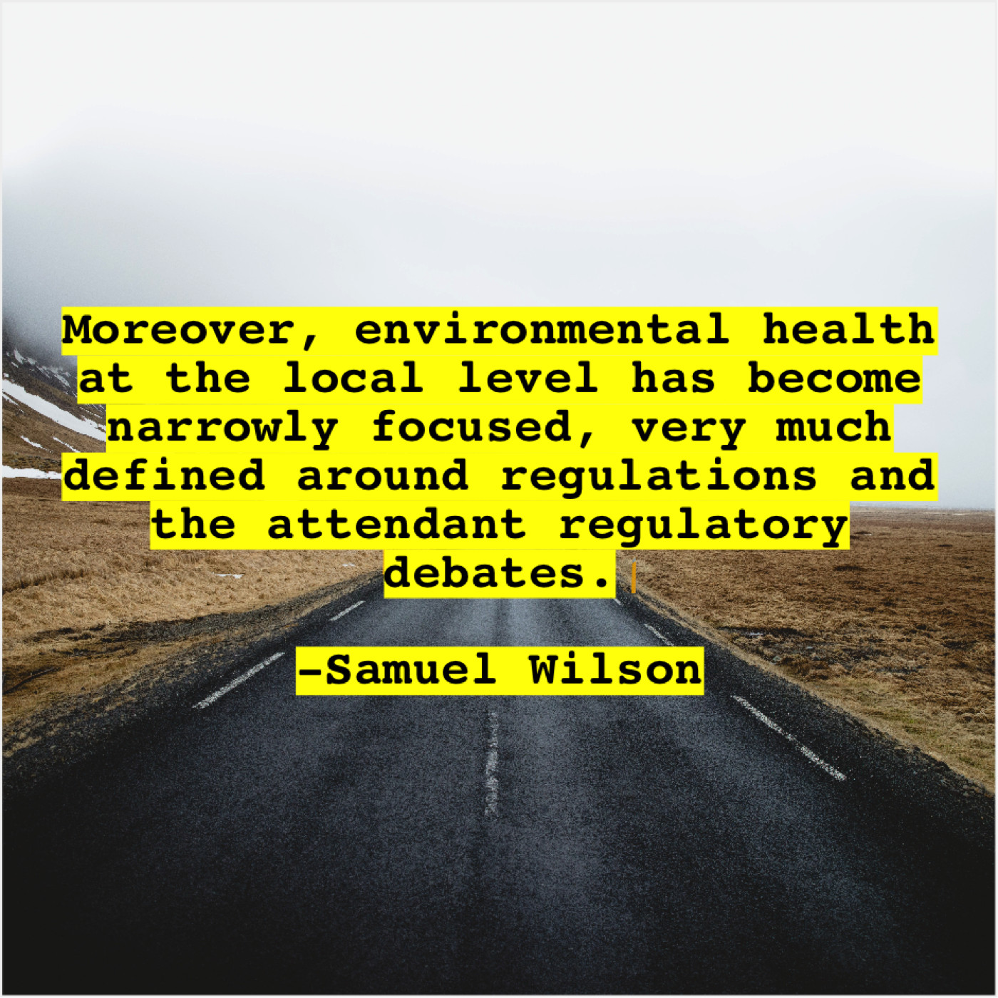 Samuel Wilson Samuel Wilson – Moreover, environmental health at the… February 5, 2019 admin “Moreover, environmental health at the local level has become narrowly focused, very much defined around regulations and the attendant regulatory debates.”-Samuel Wilson
