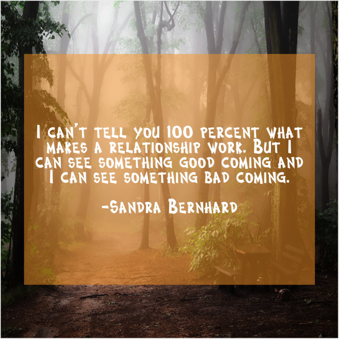 Sandra Bernhard Sandra Bernhard – I can’t tell you 100… November 2, 2018 admin “I can’t tell you 100 percent what makes a relationship work. But I can see something good coming and I can see something bad coming.”-Sandra Bernhard