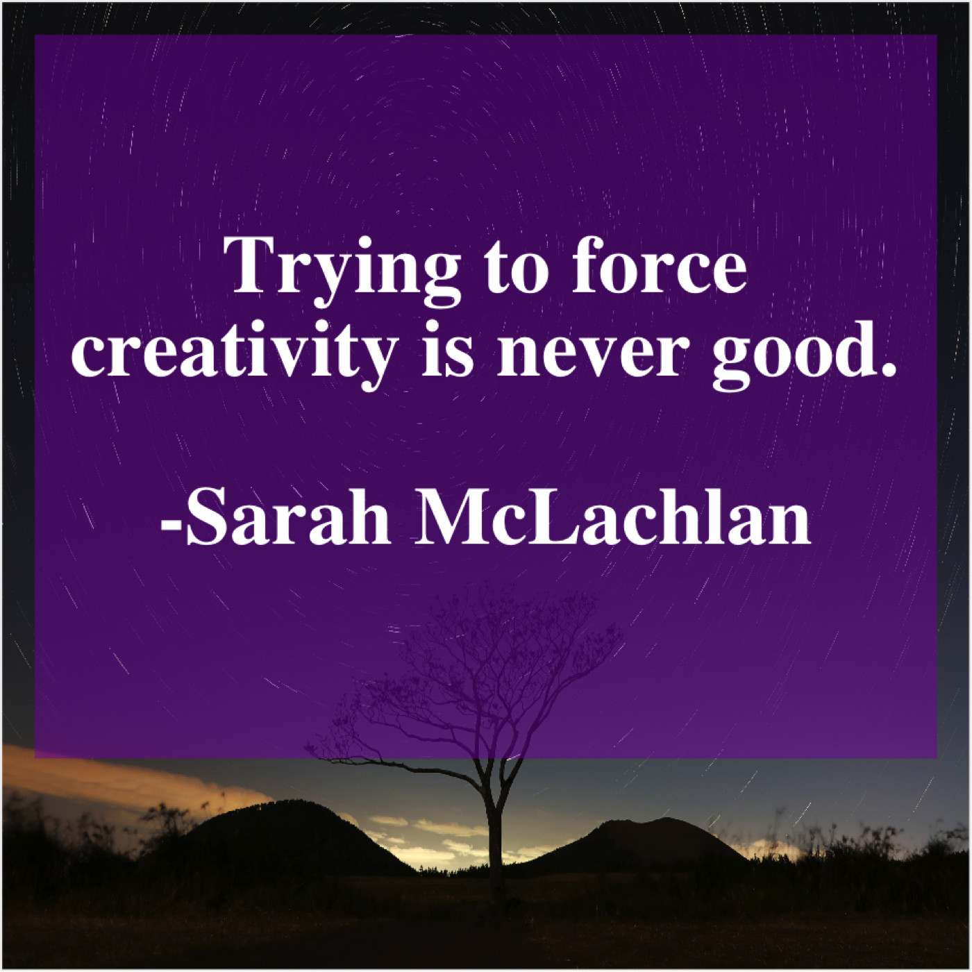Sarah McLachlan Sarah McLachlan – Trying to force creativity is… June 23, 2019 admin “Trying to force creativity is never good.”-Sarah McLachlan