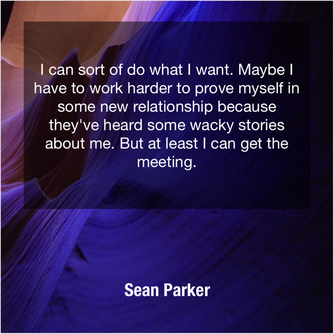 Sean Parker Sean Parker – I can sort of do… August 25, 2019 admin “I can sort of do what I want. Maybe I have to work harder to prove myself in some new relationship because they’ve heard some wacky stories about me. But at least I can get the meeting.”-Sean Parker