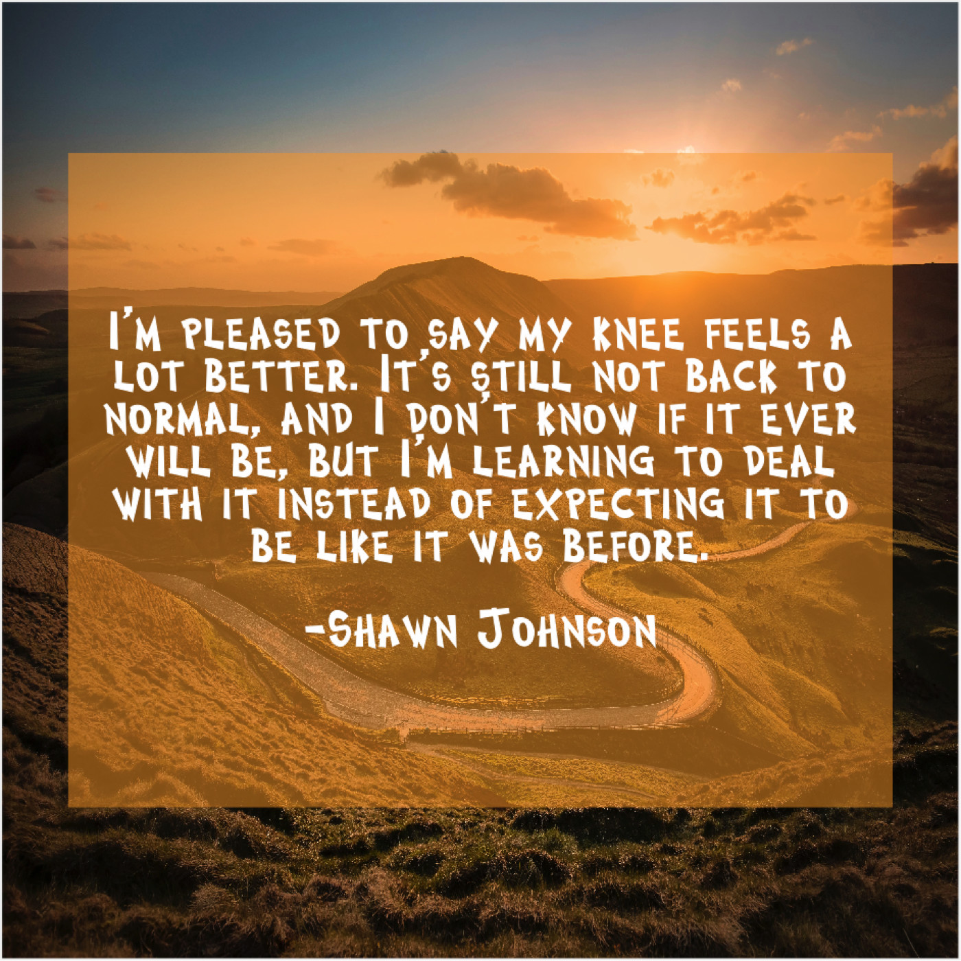 Shawn Johnson Shawn Johnson – I’m pleased to say my… January 21, 2019 admin “I’m pleased to say my knee feels a lot better. It’s still not back to normal, and I don’t know if it ever will be, but I’m learning to deal with it instead of expecting it to be like it was before.”-Shawn Johnson