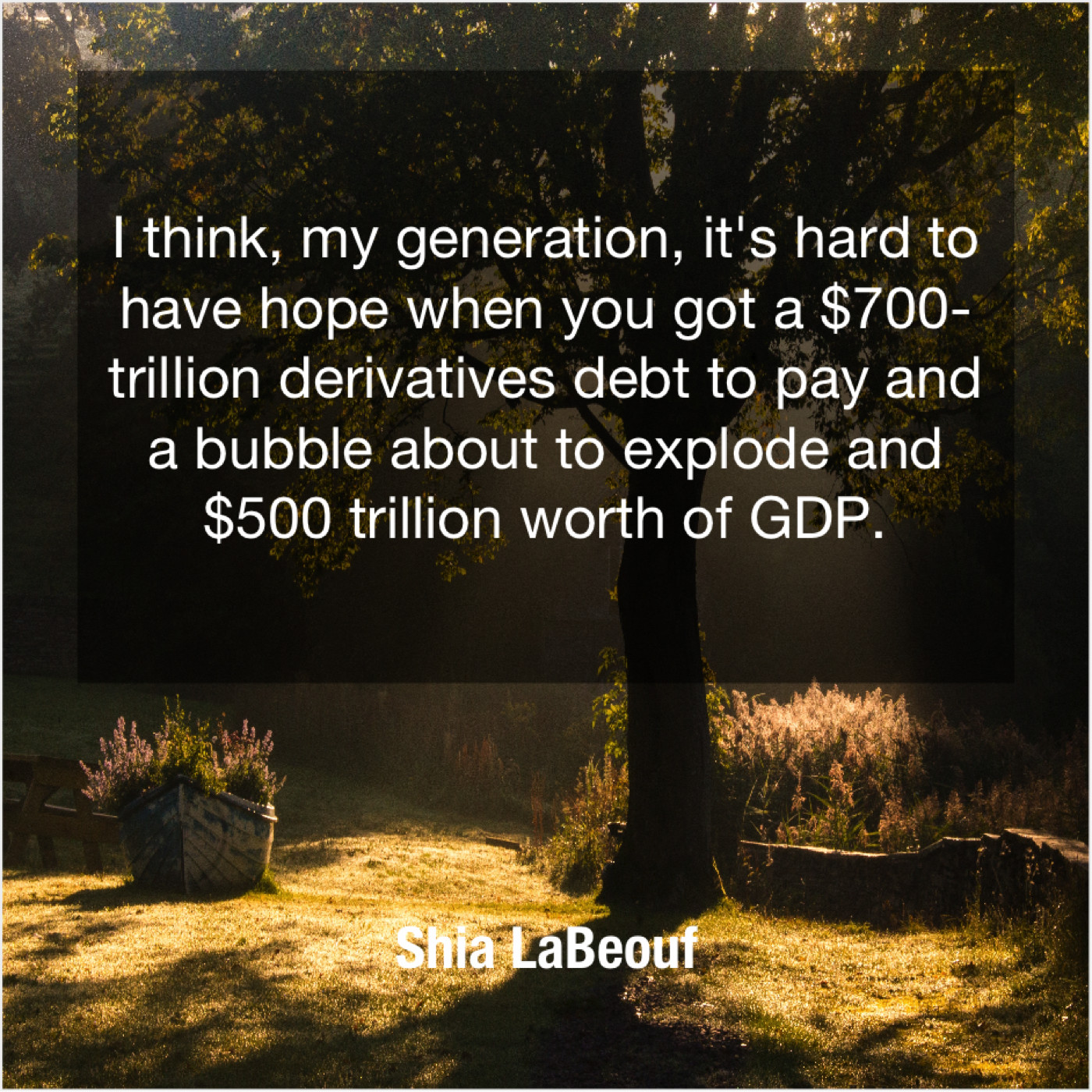 Shia LaBeouf Shia LaBeouf – I think, my generation, it’s… January 9, 2019 admin “I think, my generation, it’s hard to have hope when you got a $700-trillion derivatives debt to pay and a bubble about to explode and $500 trillion worth of GDP.”-Shia LaBeouf