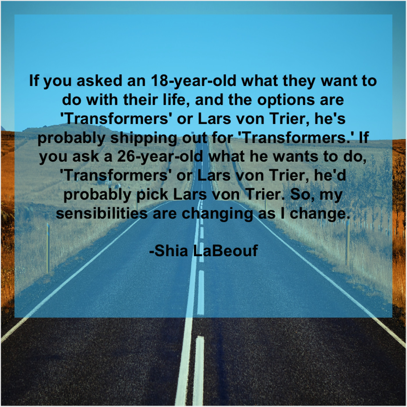 “If you asked an 18-year-old what they want to do with their life, and the options are ‘Transformers’ or Lars von Trier, he’s probably shipping out for ‘Transformers.’ If you ask a 26-year-old what he wants to do, ‘Transformers’ or Lars von Trier, he’d probably pick Lars von Trier. So, my sensibilities are changing as I change.”