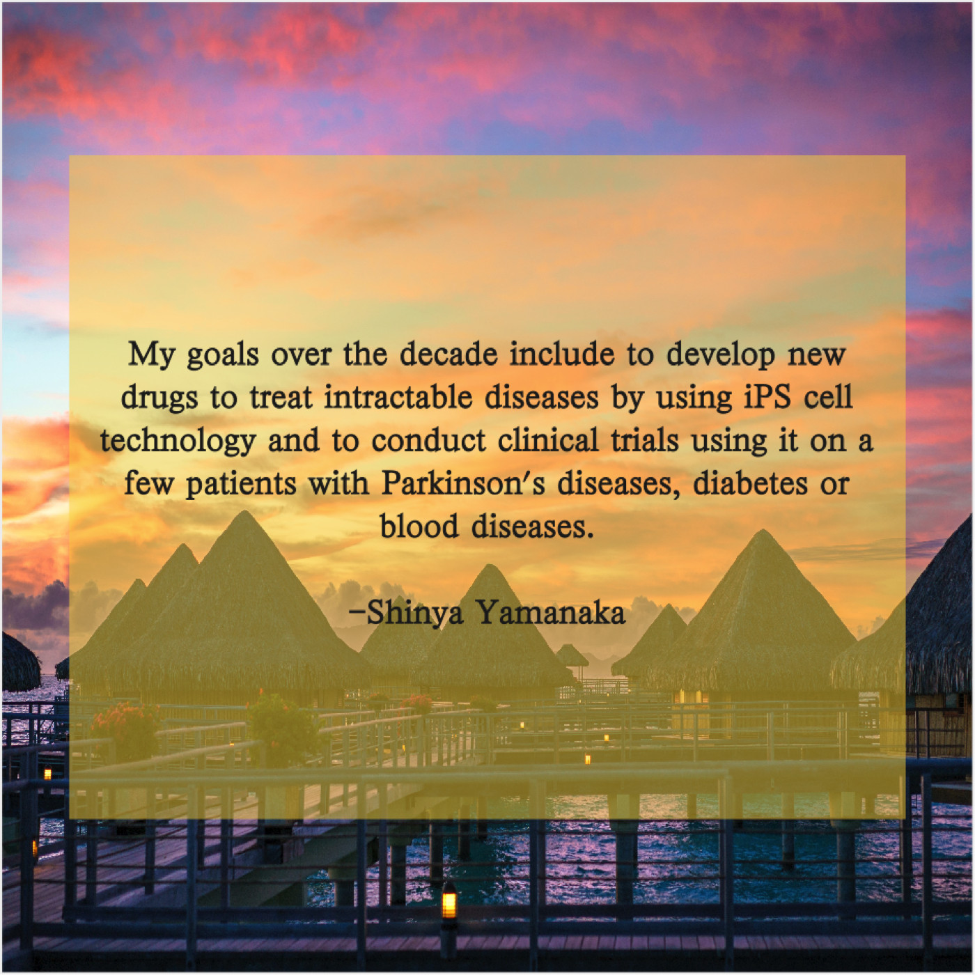 Shinya Yamanaka Shinya Yamanaka – My goals over the decade… January 19, 2019 admin “My goals over the decade include to develop new drugs to treat intractable diseases by using iPS cell technology and to conduct clinical trials using it on a few patients with Parkinson’s diseases, diabetes or blood diseases.”-Shinya Yamanaka