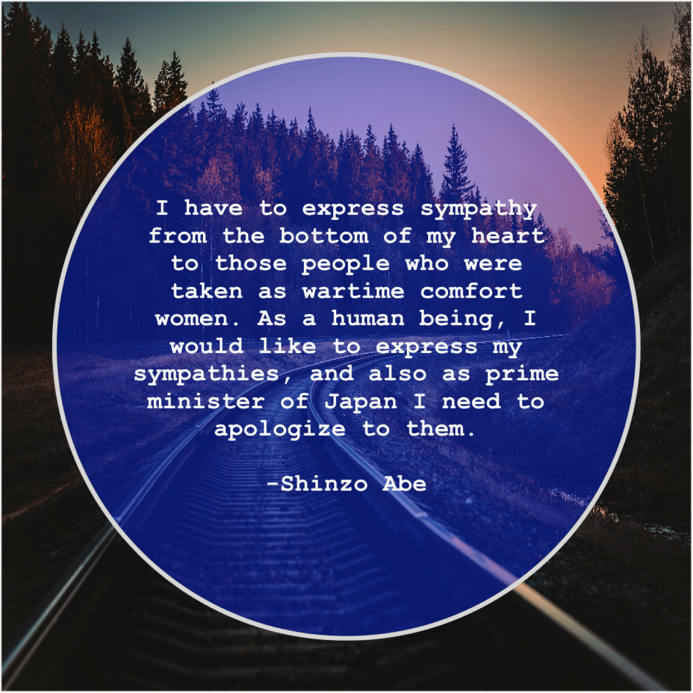 Shinzo Abe Shinzo Abe – I have to express sympathy… December 19, 2018 admin “I have to express sympathy from the bottom of my heart to those people who were taken as wartime comfort women. As a human being, I would like to express my sympathies, and also as prime minister of Japan I need to apologize to them.”-Shinzo Abe