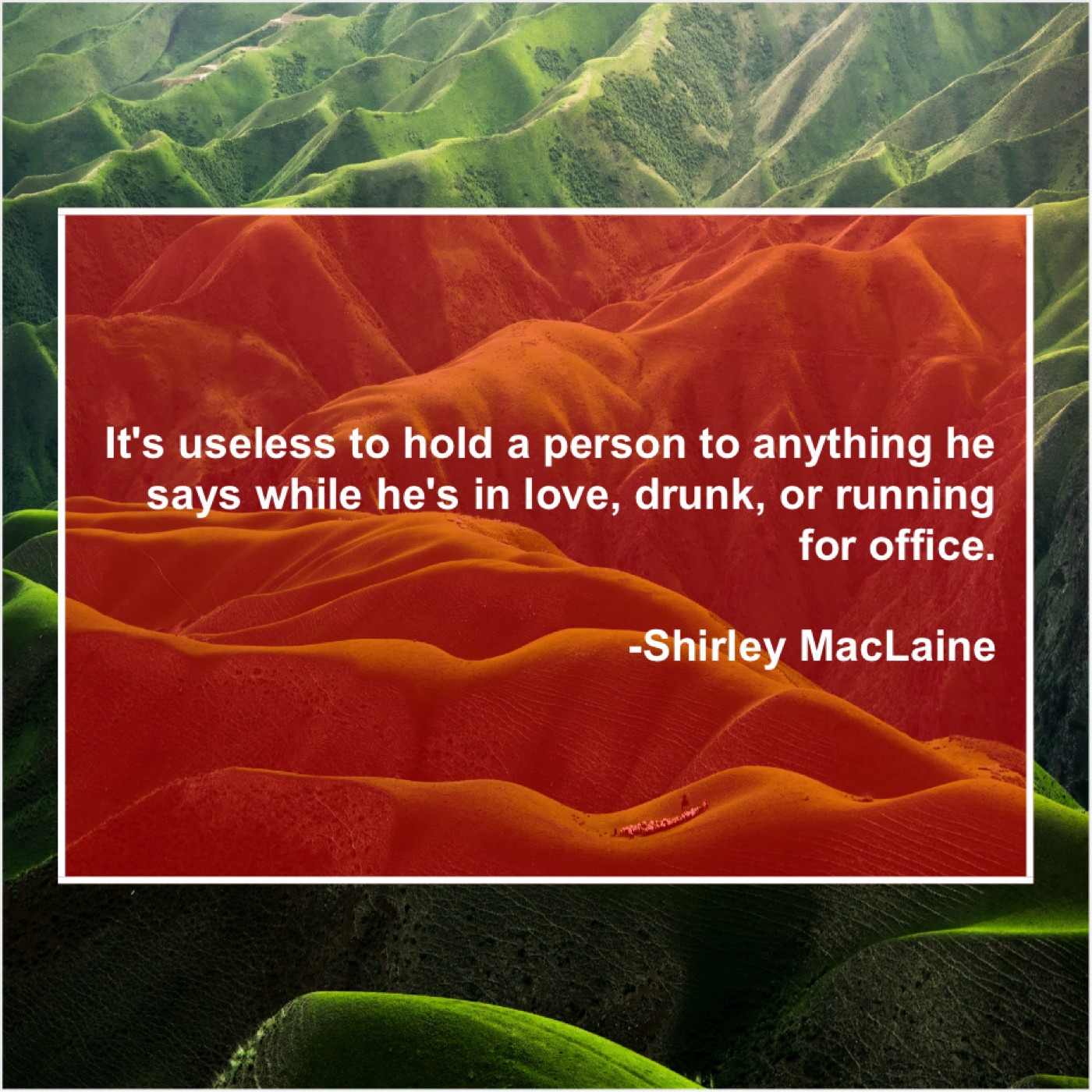 Shirley MacLaine Shirley MacLaine – It’s useless to hold a… April 16, 2019 admin “It’s useless to hold a person to anything he says while he’s in love, drunk, or running for office.”-Shirley MacLaine