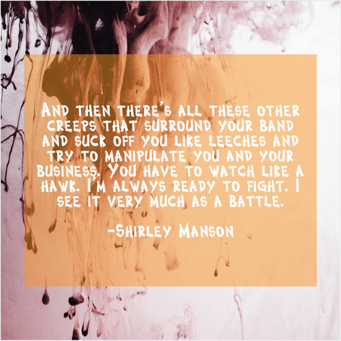 Shirley Manson Shirley Manson – And then there’s all these… April 21, 2019 admin “And then there’s all these other creeps that surround your band and suck off you like leeches and try to manipulate you and your business. You have to watch like a hawk. I’m always ready to fight. I see it very much as a battle.”-Shirley Manson