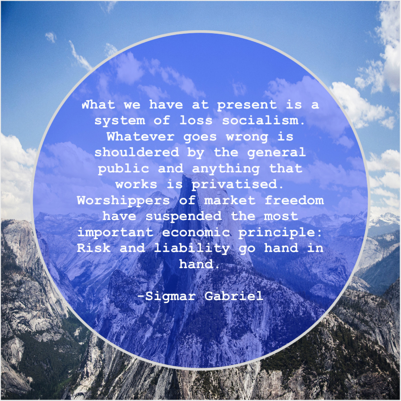 “What we have at present is a system of loss socialism. Whatever goes wrong is shouldered by the general public and anything that works is privatised. Worshippers of market freedom have suspended the most important economic principle: Risk and liability go hand in hand.”