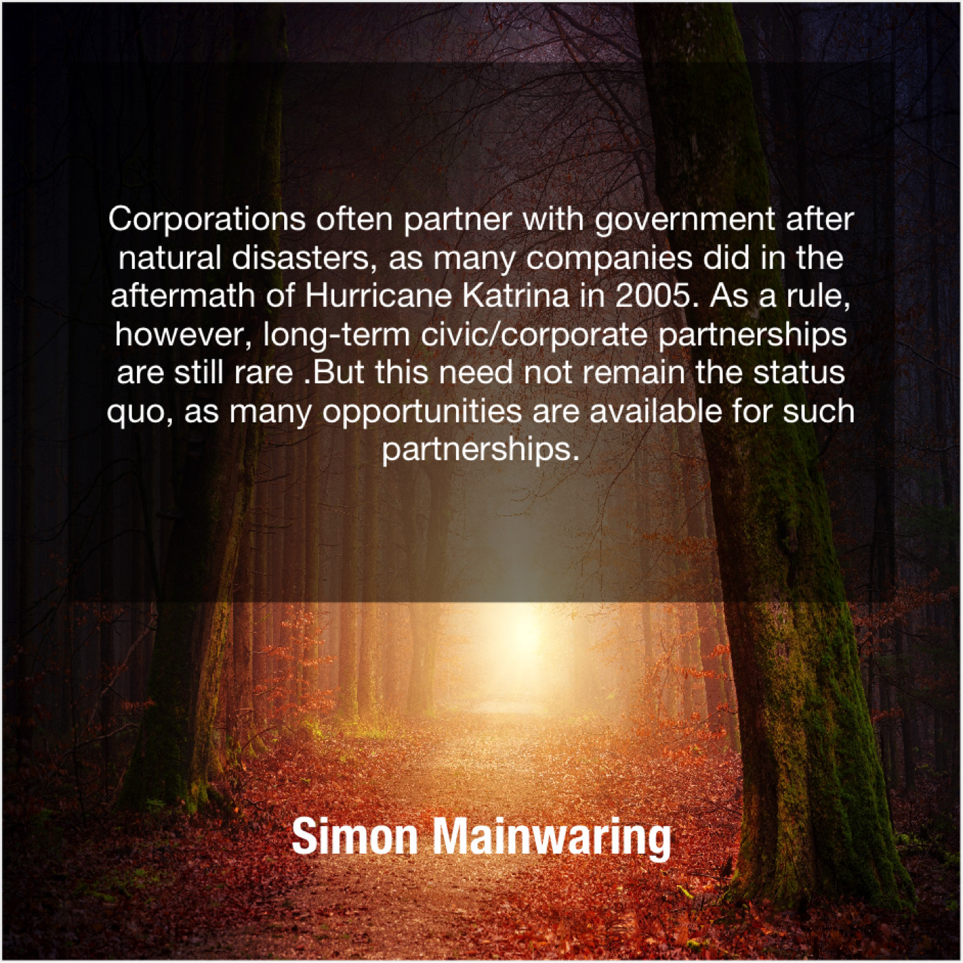 “Corporations often partner with government after natural disasters, as many companies did in the aftermath of Hurricane Katrina in 2005. As a rule, however, long-term civic/corporate partnerships are still rare .But this need not remain the status quo, as many opportunities are available for such partnerships.”