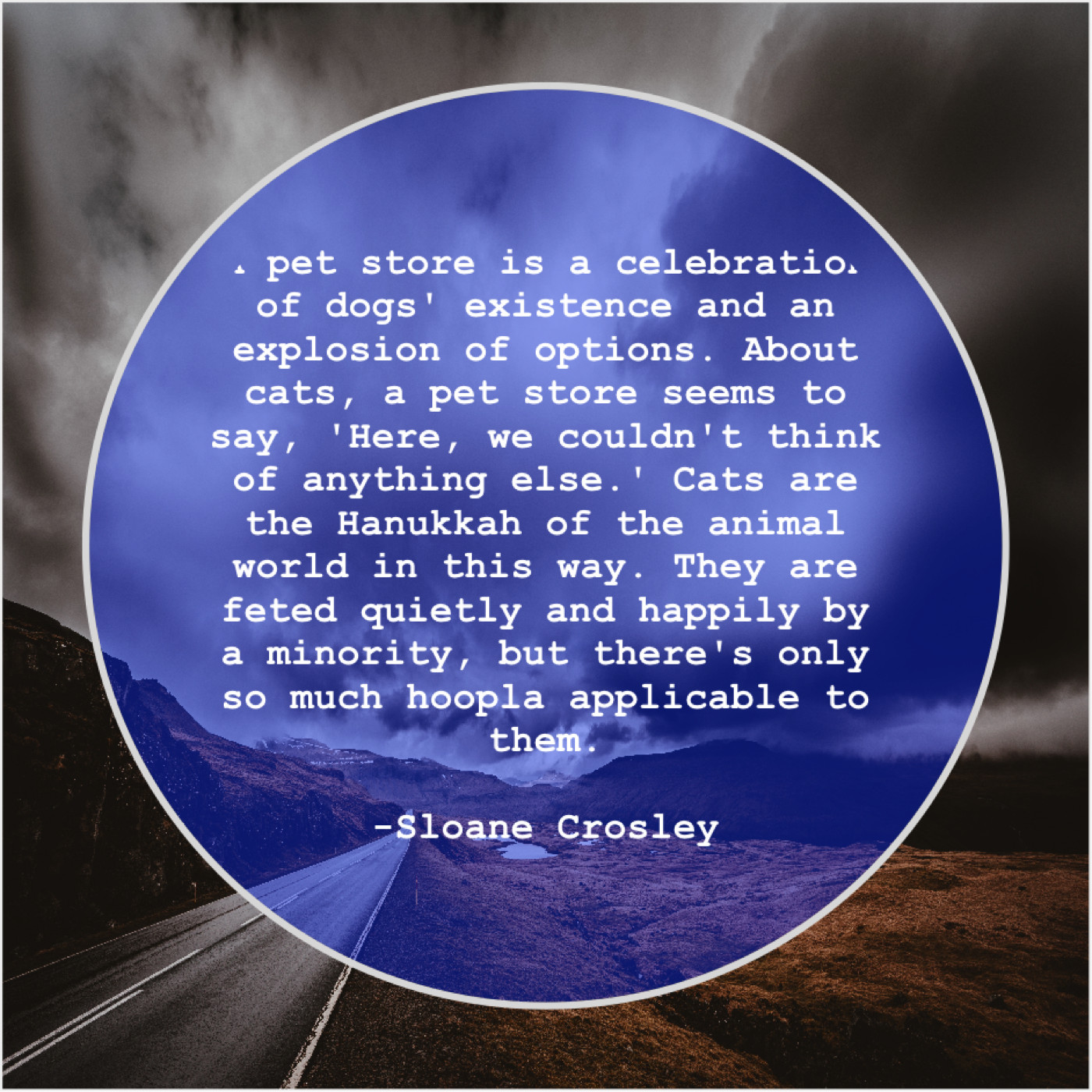 “A pet store is a celebration of dogs’ existence and an explosion of options. About cats, a pet store seems to say, ‘Here, we couldn’t think of anything else.’ Cats are the Hanukkah of the animal world in this way. They are feted quietly and happily by a minority, but there’s only so much hoopla applicable to them.”