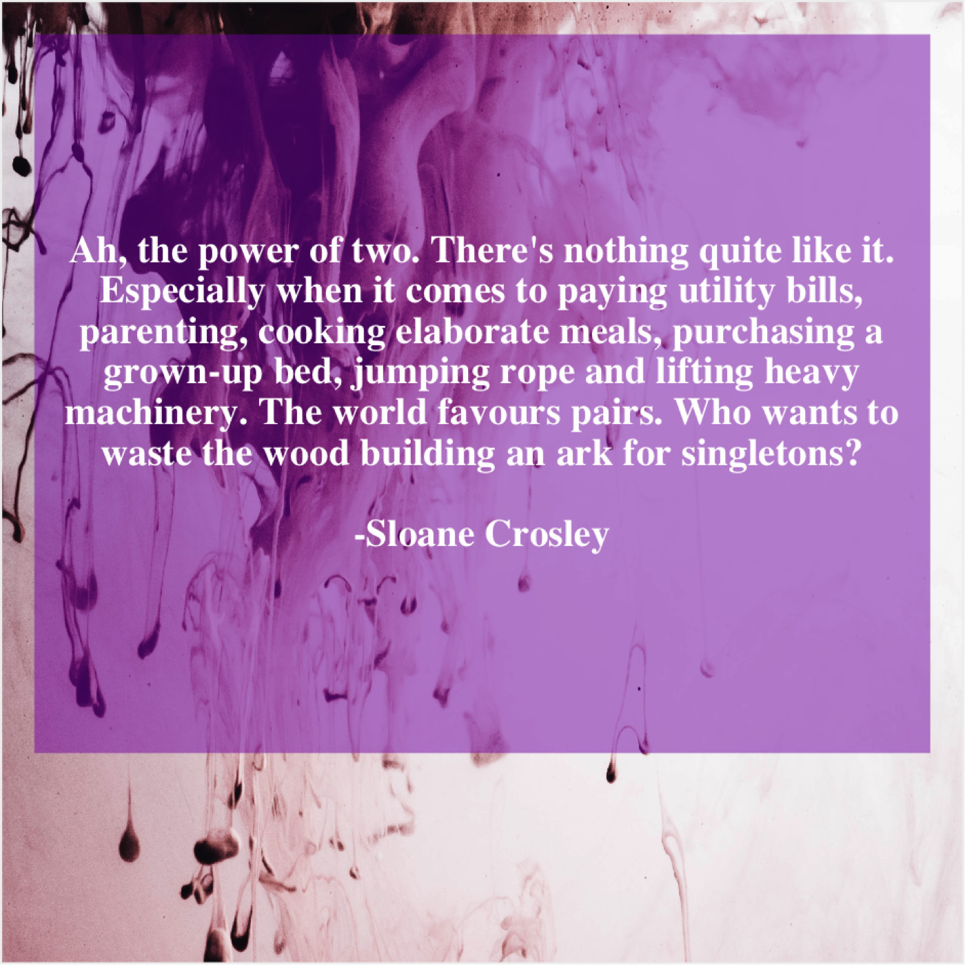“Ah, the power of two. There’s nothing quite like it. Especially when it comes to paying utility bills, parenting, cooking elaborate meals, purchasing a grown-up bed, jumping rope and lifting heavy machinery. The world favours pairs. Who wants to waste the wood building an ark for singletons?”