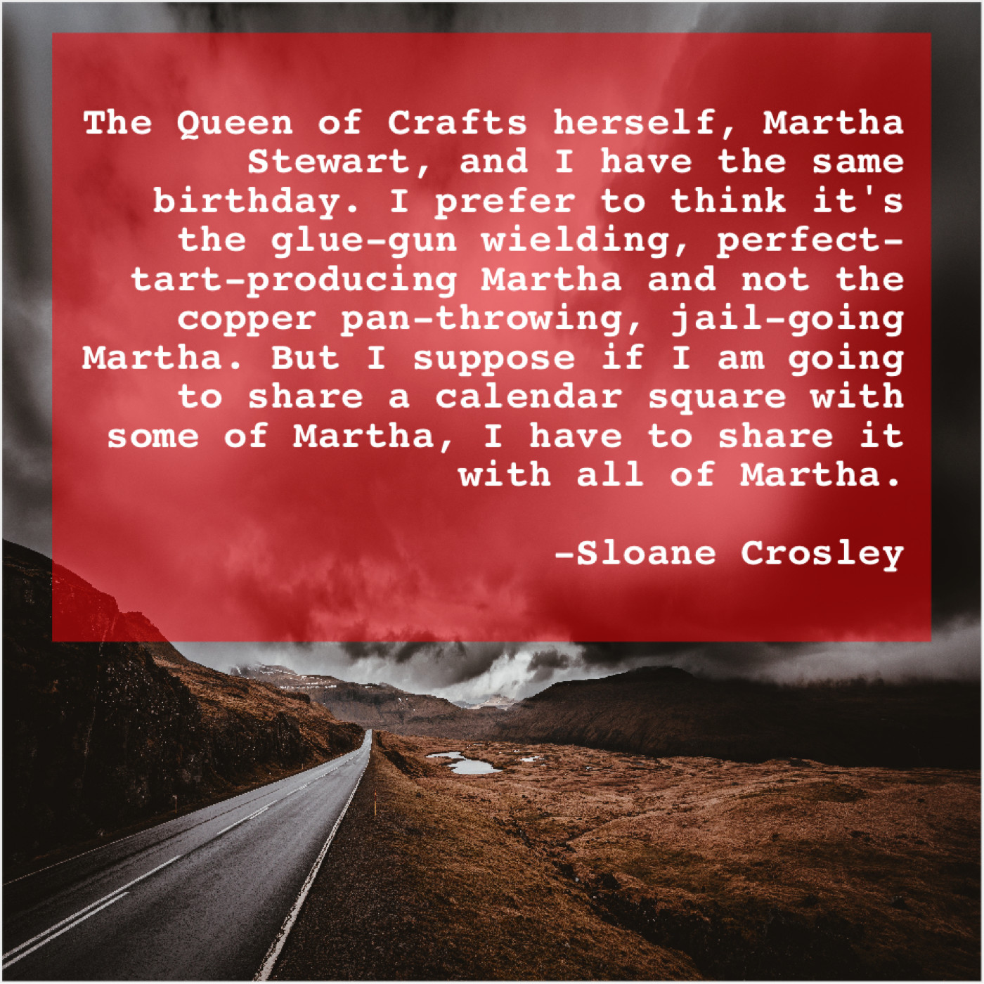 “The Queen of Crafts herself, Martha Stewart, and I have the same birthday. I prefer to think it’s the glue-gun wielding, perfect-tart-producing Martha and not the copper pan-throwing, jail-going Martha. But I suppose if I am going to share a calendar square with some of Martha, I have to share it with all of Martha.”