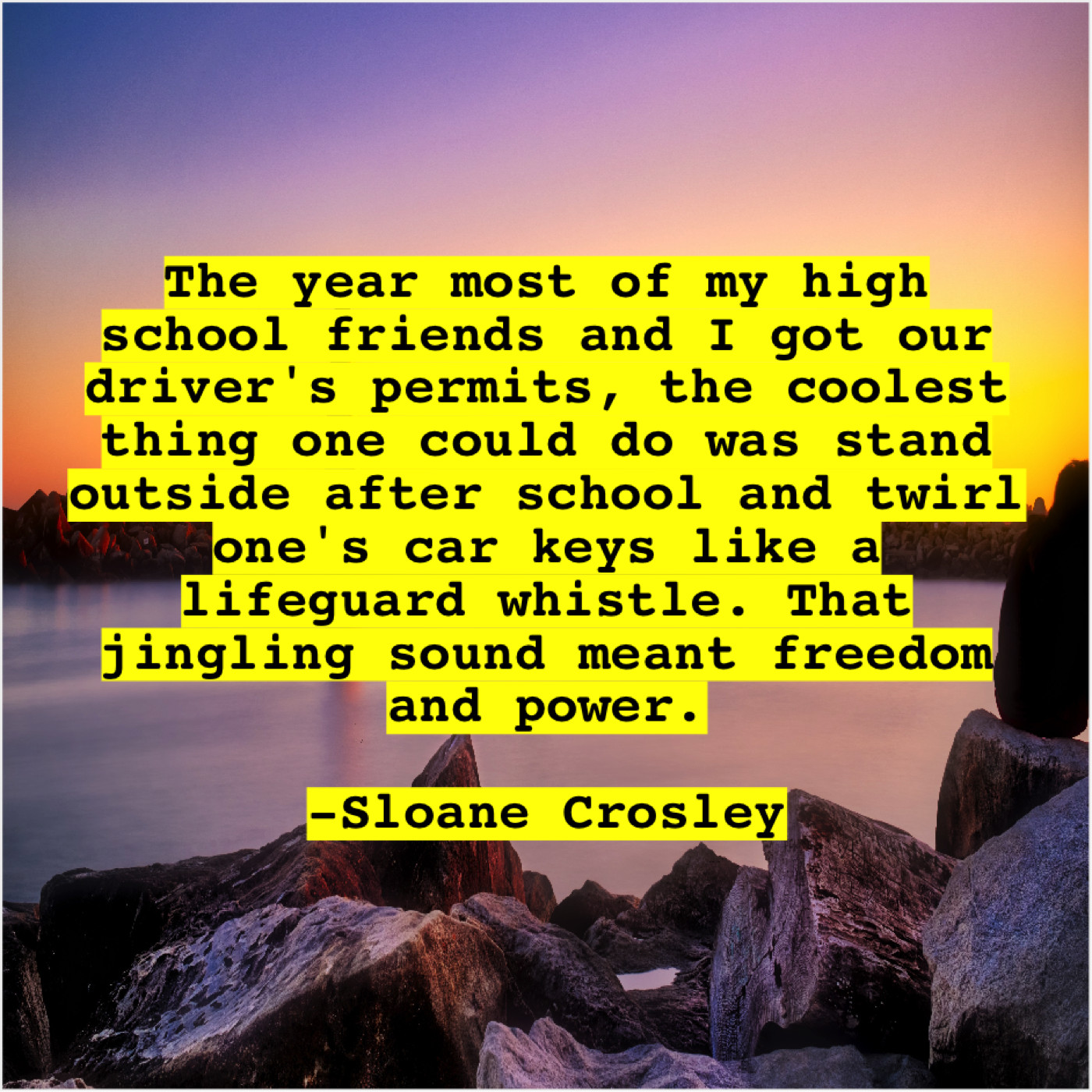 Sloane Crosley Sloane Crosley – The year most of my… September 2, 2019 admin “The year most of my high school friends and I got our driver’s permits, the coolest thing one could do was stand outside after school and twirl one’s car keys like a lifeguard whistle. That jingling sound meant freedom and power.”-Sloane Crosley