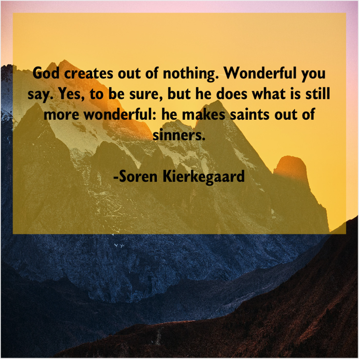 Soren Kierkegaard Soren Kierkegaard – God creates out of nothing… May 1, 2019 admin “God creates out of nothing. Wonderful you say. Yes, to be sure, but he does what is still more wonderful: he makes saints out of sinners.”-Soren Kierkegaard