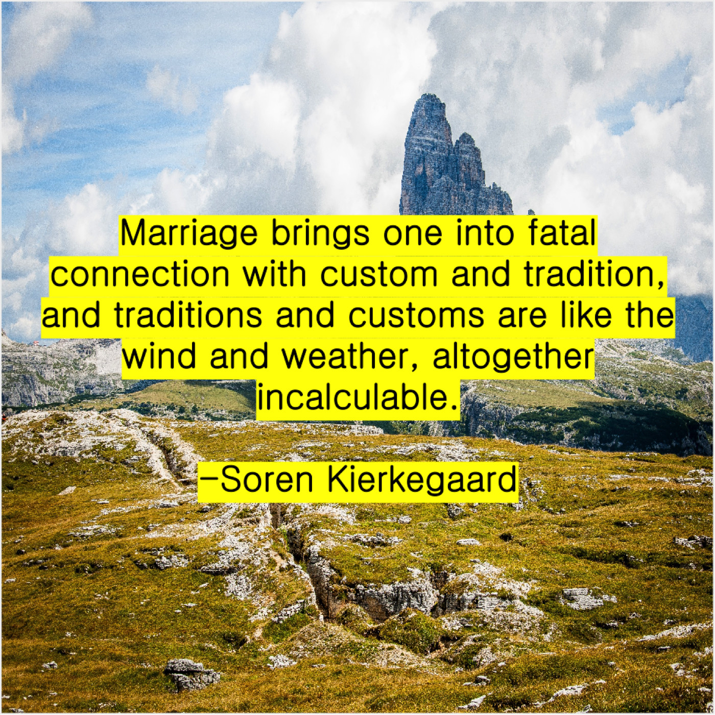 Soren Kierkegaard Soren Kierkegaard – Marriage brings one into fatal… March 23, 2019 admin “Marriage brings one into fatal connection with custom and tradition, and traditions and customs are like the wind and weather, altogether incalculable.”-Soren Kierkegaard