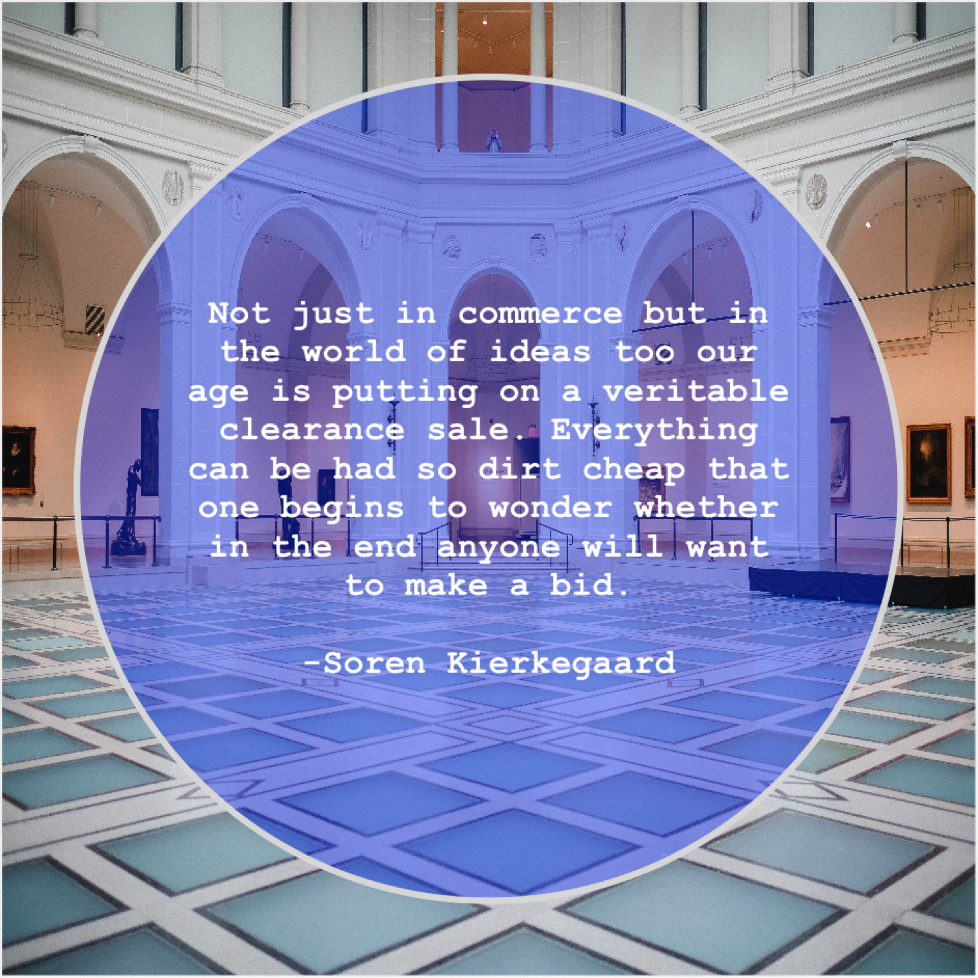 Soren Kierkegaard Soren Kierkegaard – Not just in commerce but… November 17, 2018 admin “Not just in commerce but in the world of ideas too our age is putting on a veritable clearance sale. Everything can be had so dirt cheap that one begins to wonder whether in the end anyone will want to make a bid.”-Soren Kierkegaard