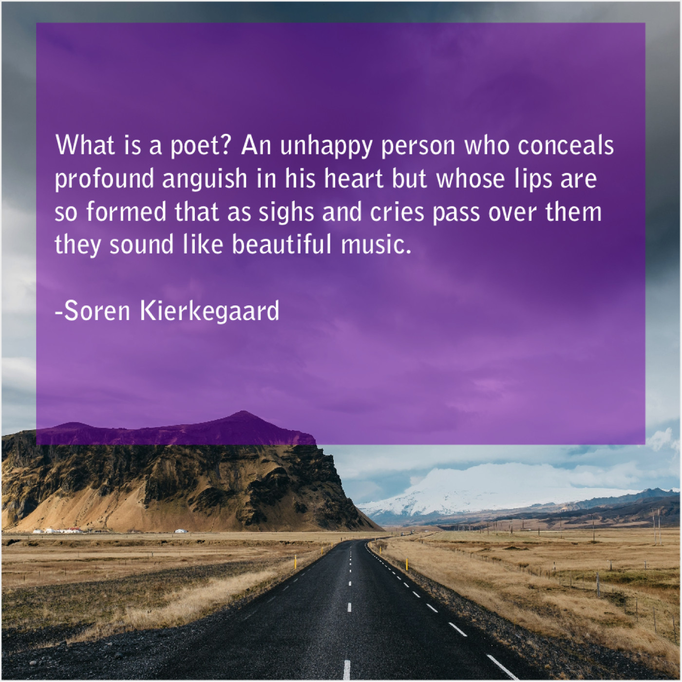 Soren Kierkegaard Soren Kierkegaard – What is a poet? An… October 29, 2018 admin “What is a poet? An unhappy person who conceals profound anguish in his heart but whose lips are so formed that as sighs and cries pass over them they sound like beautiful music.”-Soren Kierkegaard