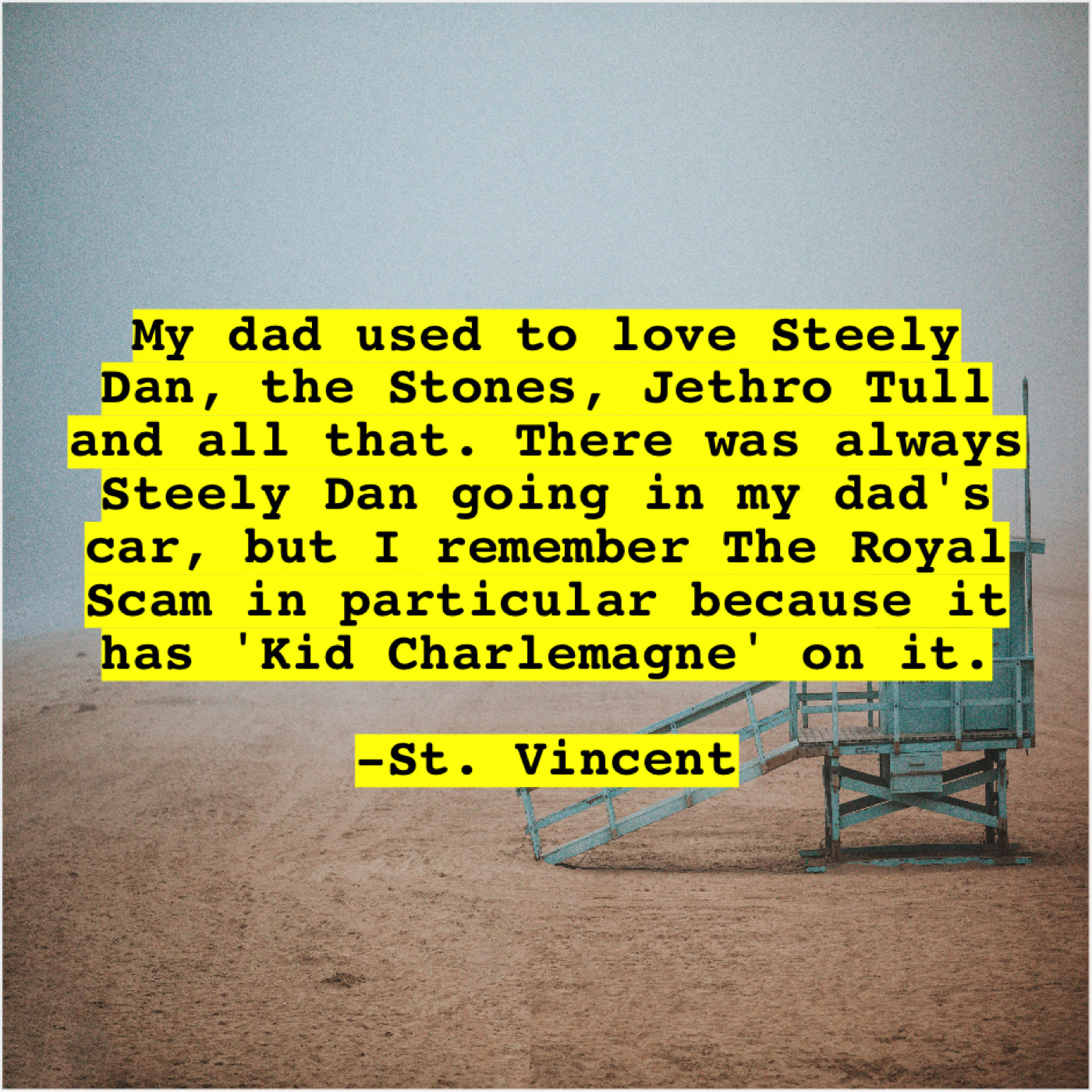 St. Vincent St. Vincent – My dad used to love… November 10, 2018 admin “My dad used to love Steely Dan, the Stones, Jethro Tull and all that. There was always Steely Dan going in my dad’s car, but I remember The Royal Scam in particular because it has ‘Kid Charlemagne’ on it.”-St. Vincent