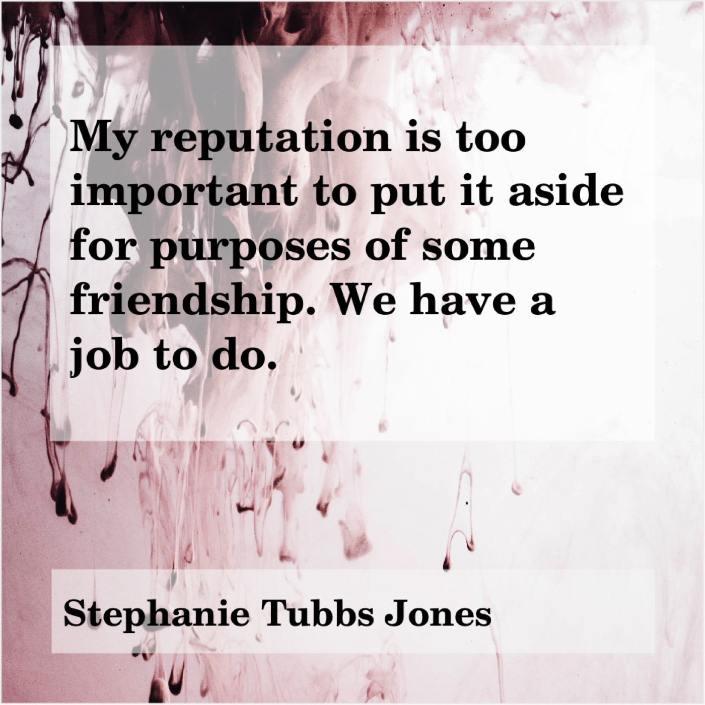 Stephanie Tubbs Jones Stephanie Tubbs Jones – My reputation is too important… June 7, 2019 admin “My reputation is too important to put it aside for purposes of some friendship. We have a job to do.”-Stephanie Tubbs Jones