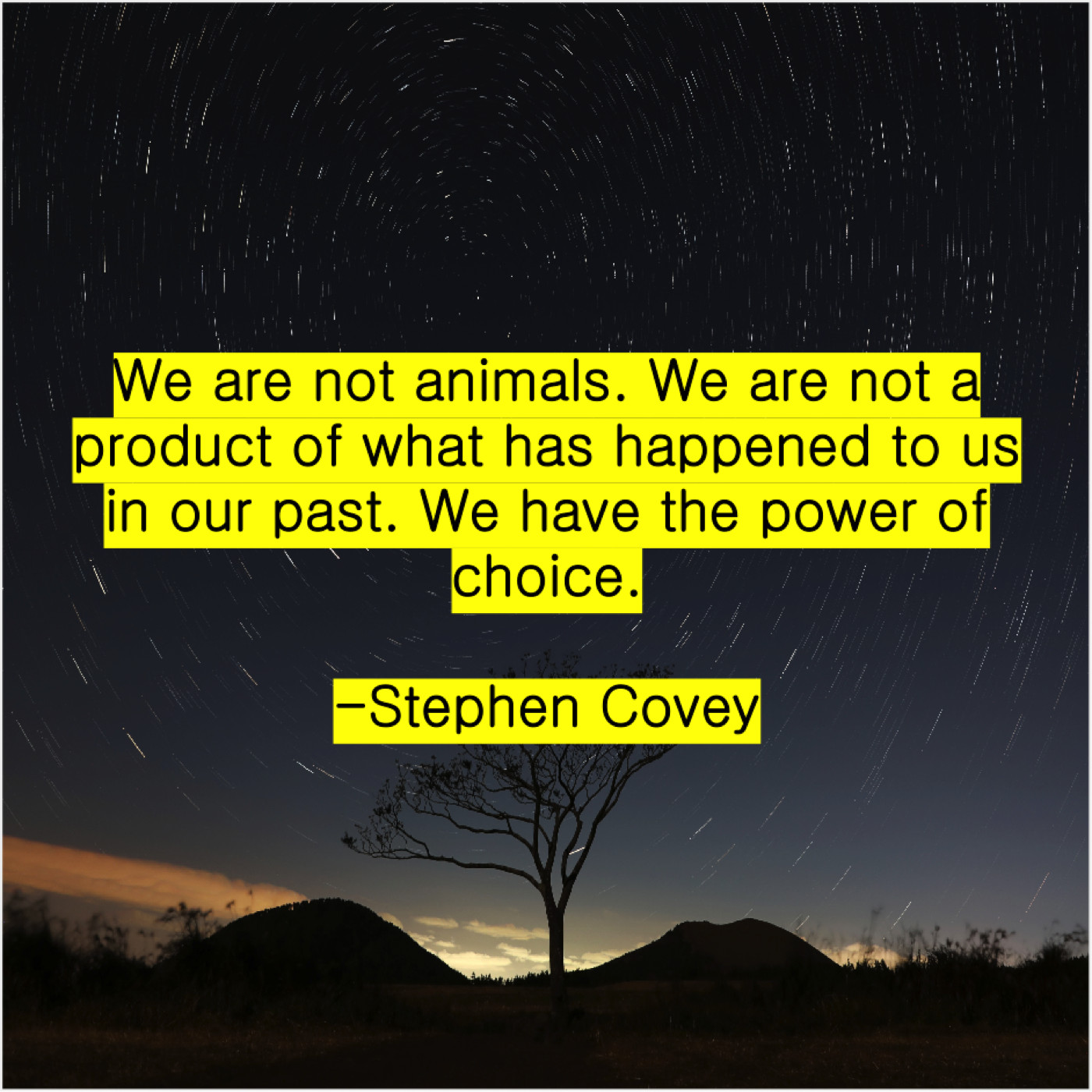 Stephen Covey Stephen Covey – We are not animals. We… September 18, 2019 admin “We are not animals. We are not a product of what has happened to us in our past. We have the power of choice.”-Stephen Covey