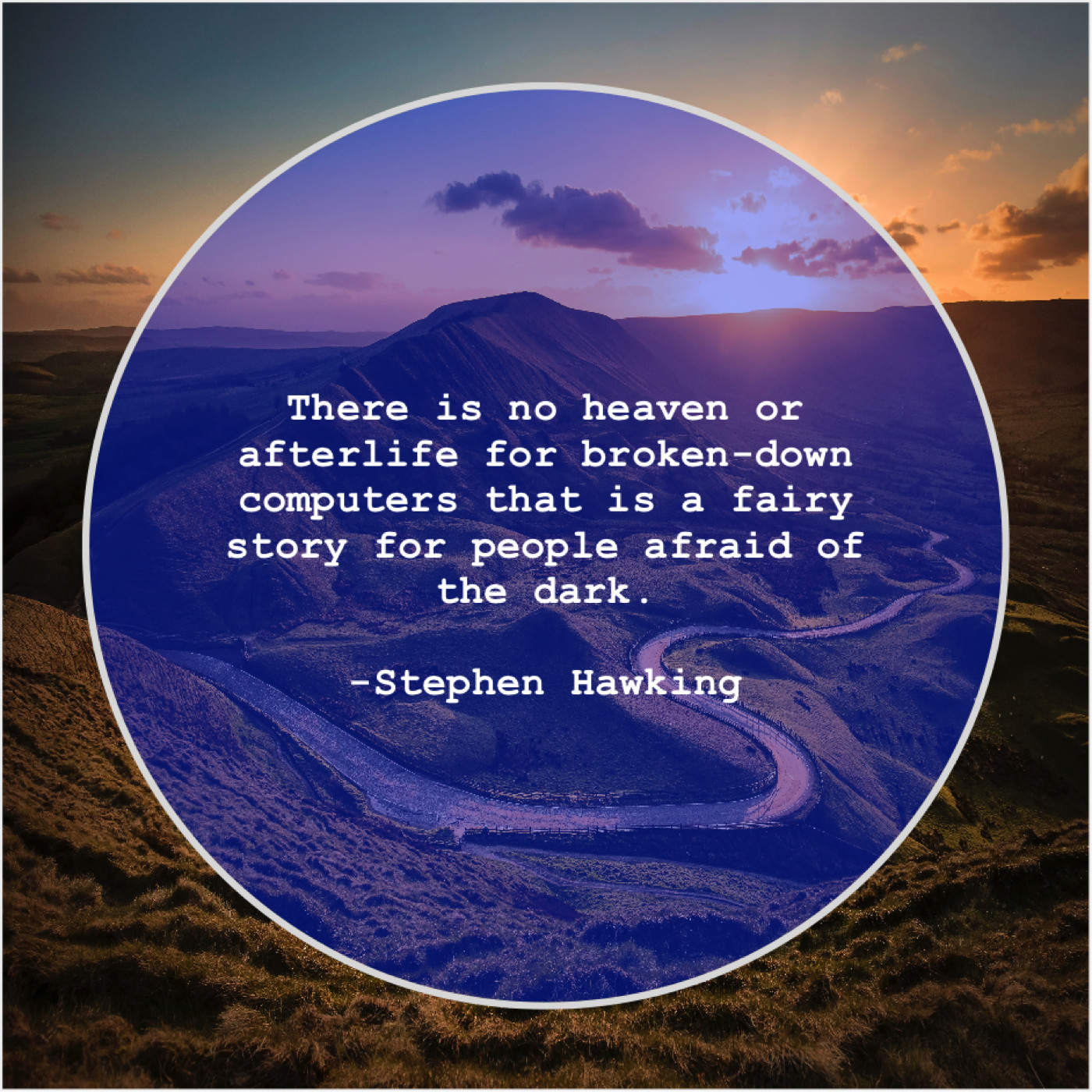 Stephen Hawking Stephen Hawking – There is no heaven or… April 23, 2019 admin “There is no heaven or afterlife for broken-down computers that is a fairy story for people afraid of the dark.”-Stephen Hawking