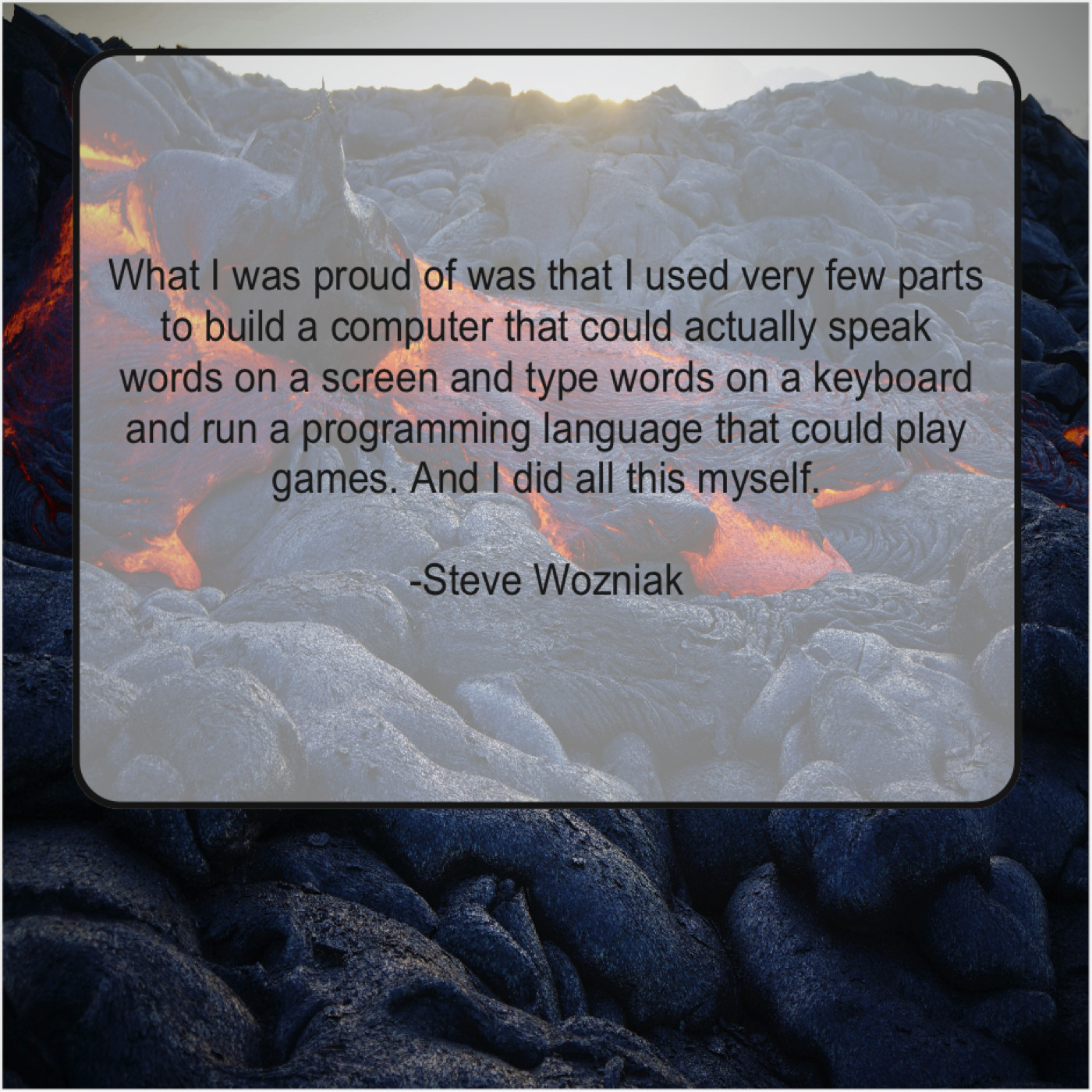 Steve Wozniak Steve Wozniak – What I was proud of… December 20, 2018 admin “What I was proud of was that I used very few parts to build a computer that could actually speak words on a screen and type words on a keyboard and run a programming language that could play games. And I did all this myself.”-Steve Wozniak