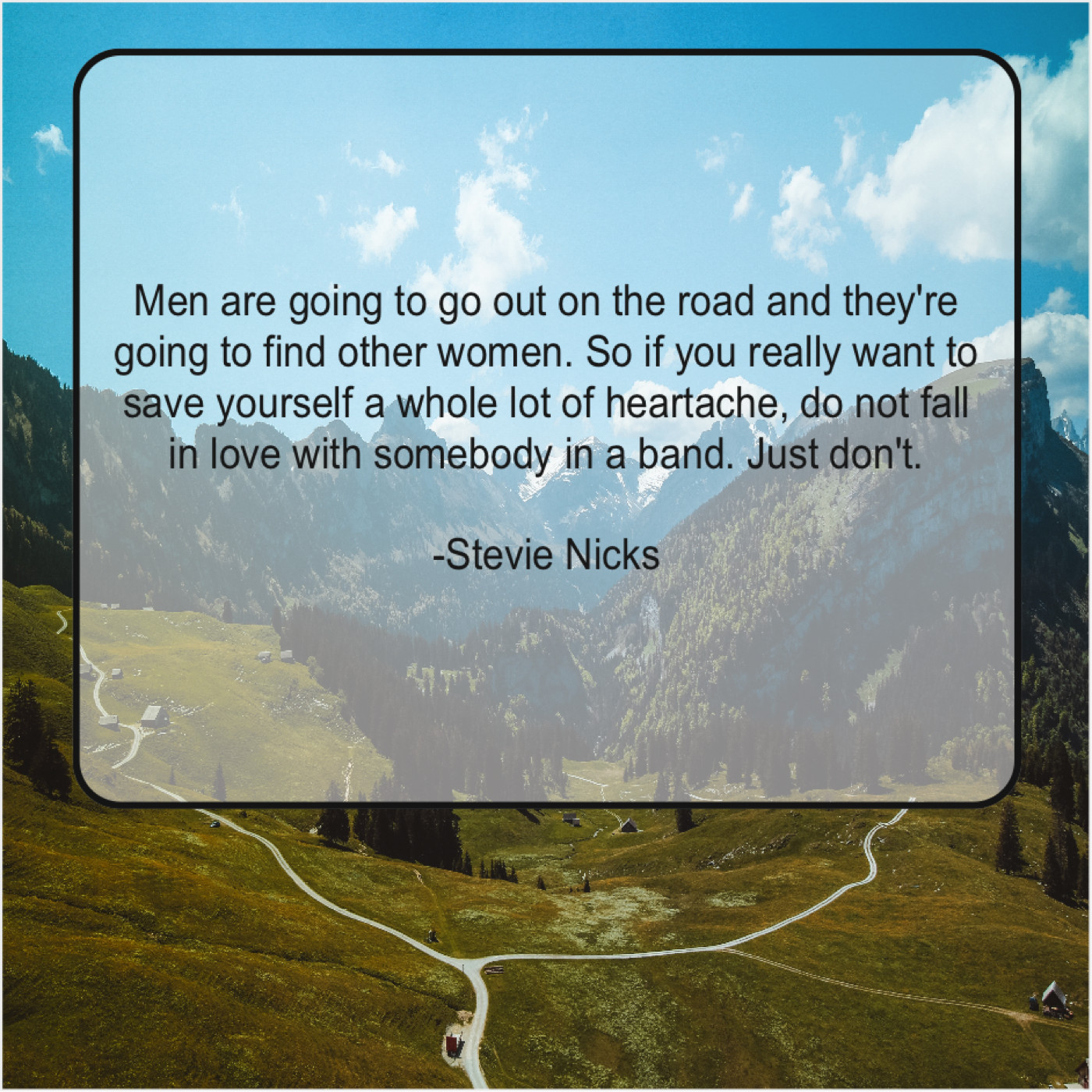 Stevie Nicks Stevie Nicks – Men are going to go… August 28, 2019 admin “Men are going to go out on the road and they’re going to find other women. So if you really want to save yourself a whole lot of heartache, do not fall in love with somebody in a band. Just don’t.”-Stevie Nicks