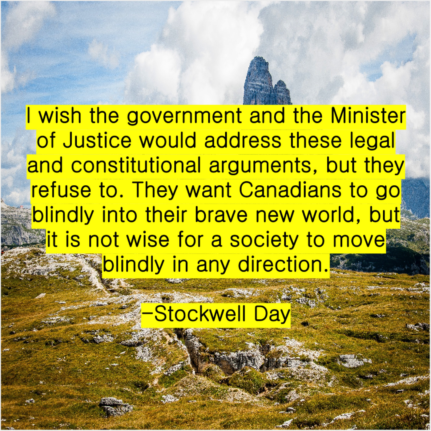 “I wish the government and the Minister of Justice would address these legal and constitutional arguments, but they refuse to. They want Canadians to go blindly into their brave new world, but it is not wise for a society to move blindly in any direction.”