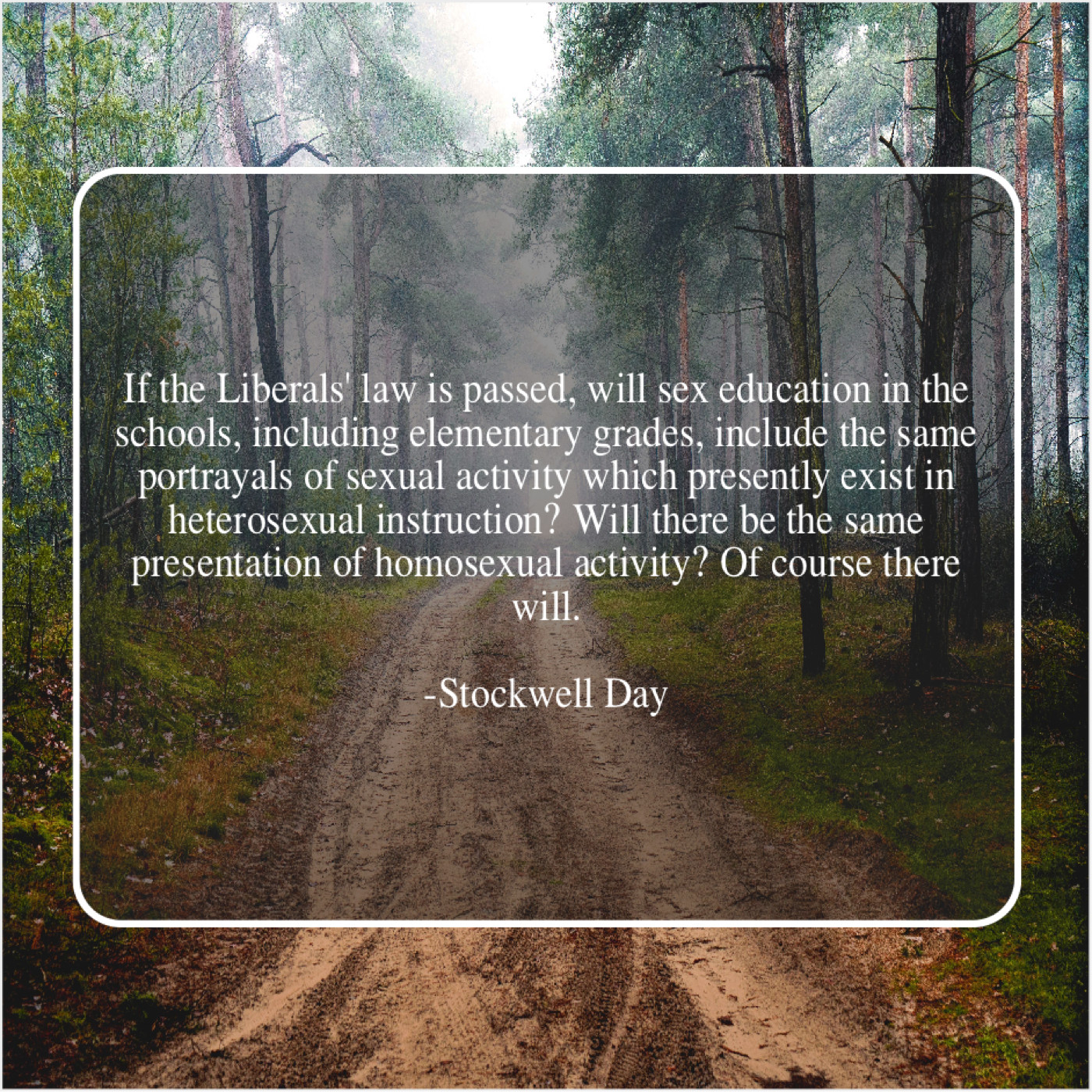 “If the Liberals’ law is passed, will sex education in the schools, including elementary grades, include the same portrayals of sexual activity which presently exist in heterosexual instruction? Will there be the same presentation of homosexual activity? Of course there will.”