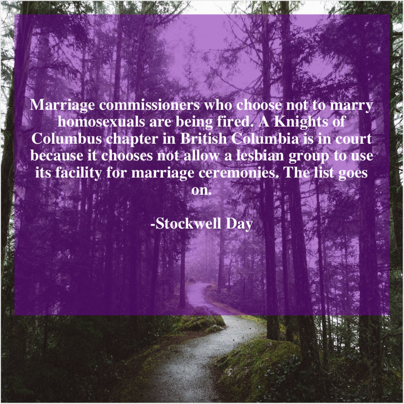 “Marriage commissioners who choose not to marry homosexuals are being fired. A Knights of Columbus chapter in British Columbia is in court because it chooses not allow a lesbian group to use its facility for marriage ceremonies. The list goes on.”
