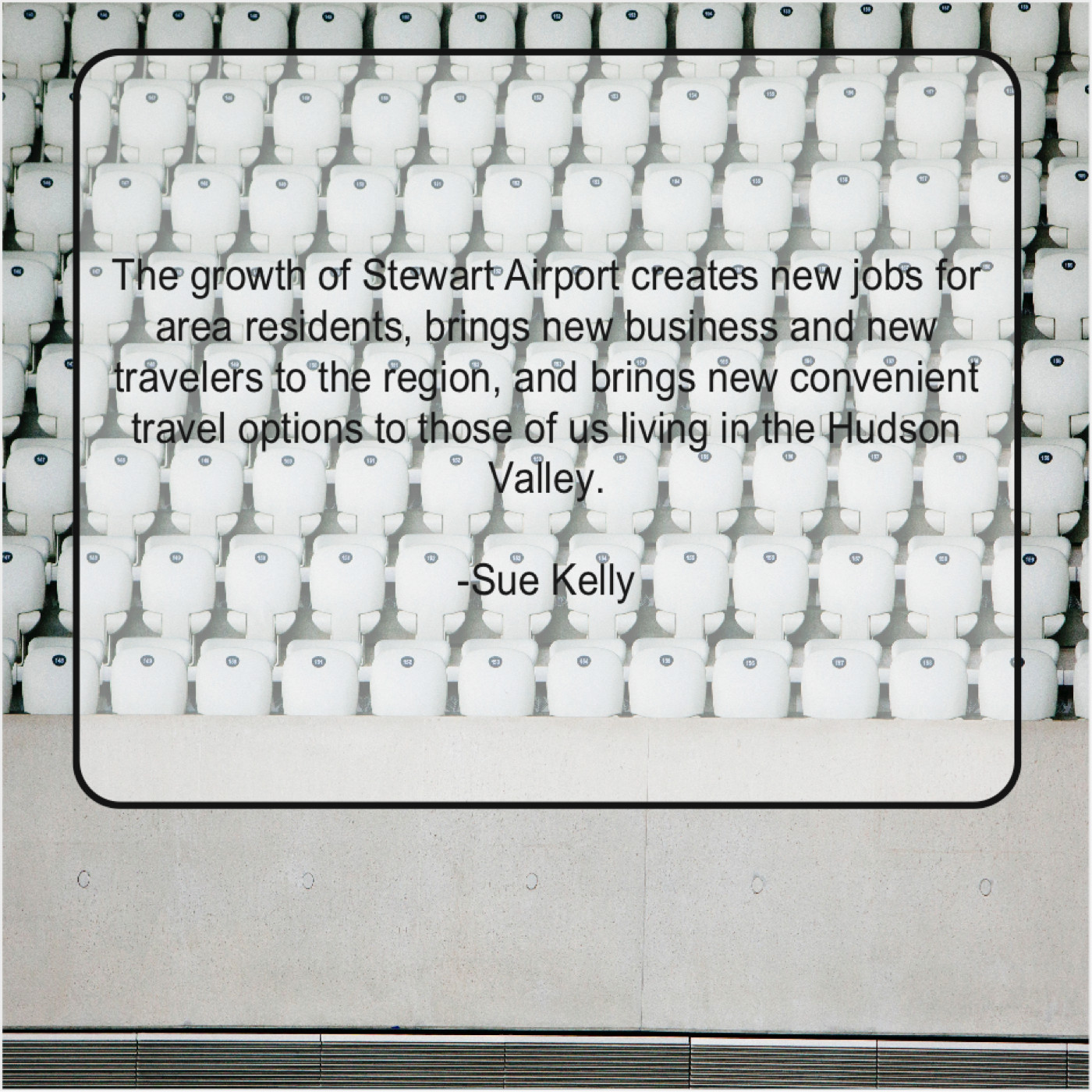 Sue Kelly Sue Kelly – The growth of Stewart Airport… September 11, 2019 admin “The growth of Stewart Airport creates new jobs for area residents, brings new business and new travelers to the region, and brings new convenient travel options to those of us living in the Hudson Valley.”-Sue Kelly