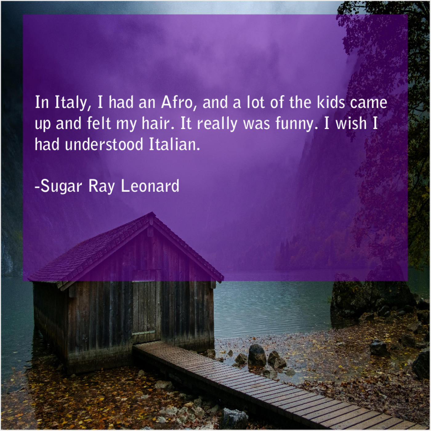 Sugar Ray Leonard Sugar Ray Leonard – In Italy, I had an… May 4, 2019 admin “In Italy, I had an Afro, and a lot of the kids came up and felt my hair. It really was funny. I wish I had understood Italian.”-Sugar Ray Leonard