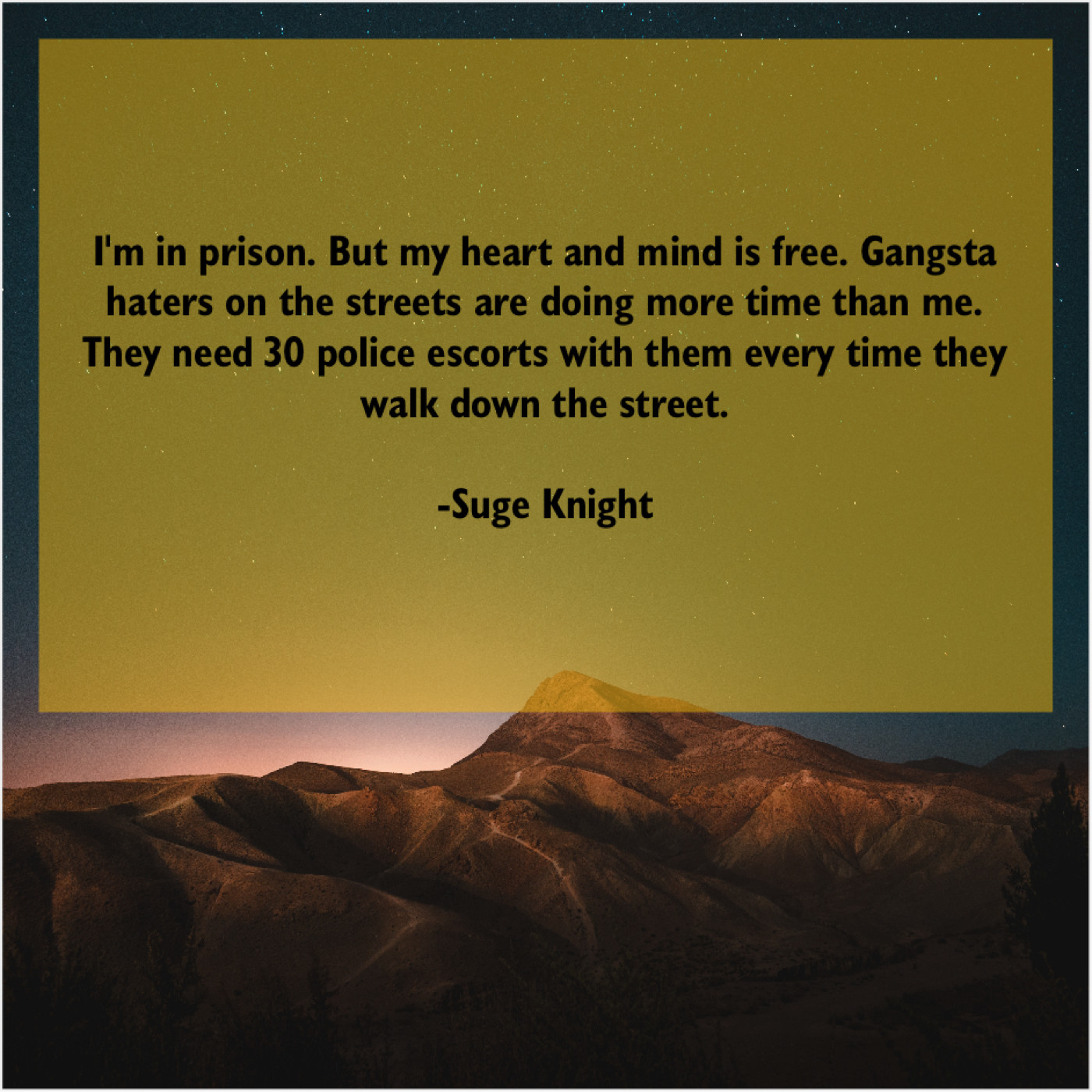 Suge Knight Suge Knight – I’m in prison. But my… March 22, 2019 admin “I’m in prison. But my heart and mind is free. Gangsta haters on the streets are doing more time than me. They need 30 police escorts with them every time they walk down the street.”-Suge Knight
