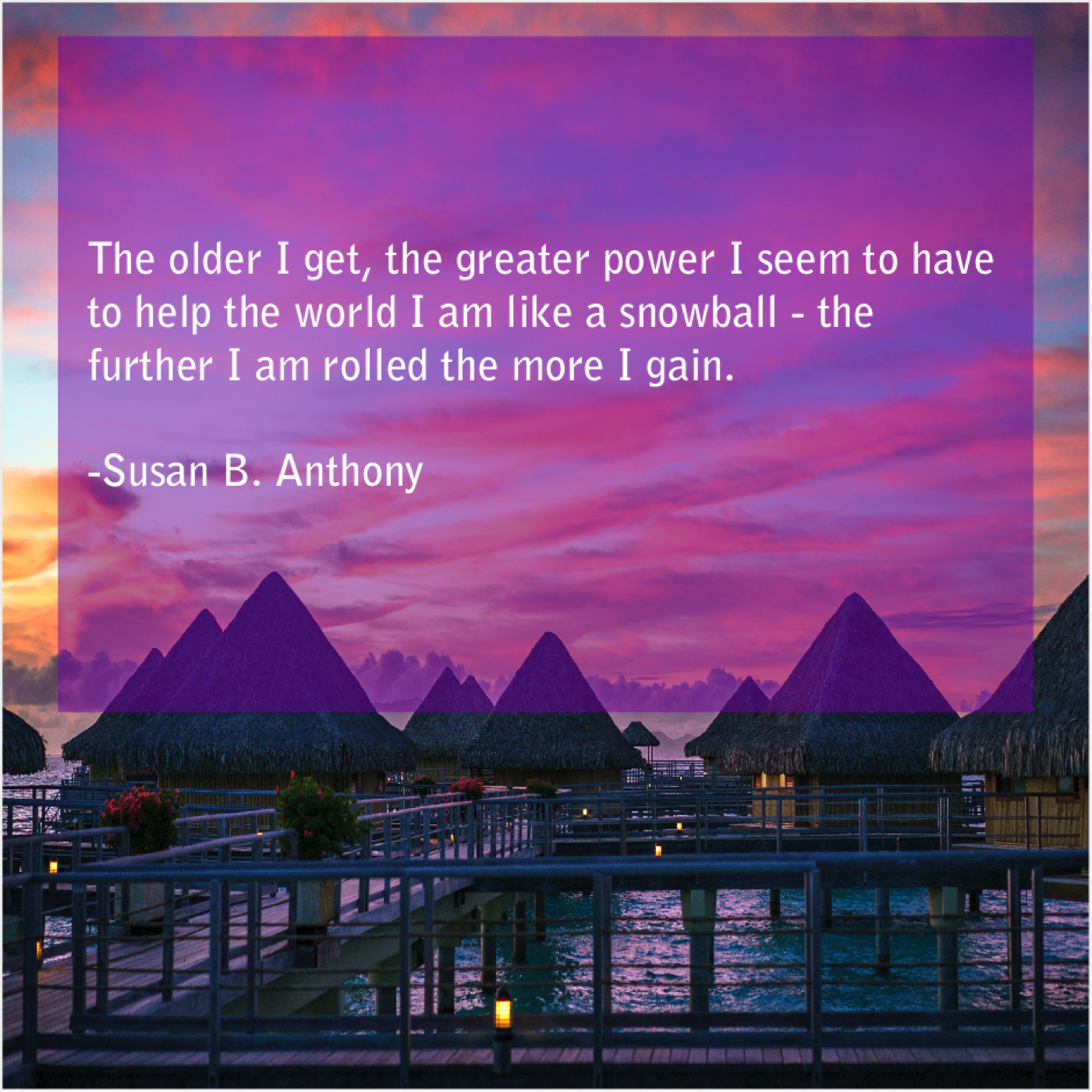 Susan B. Anthony Susan B. Anthony – The older I get, the… July 8, 2019 admin “The older I get, the greater power I seem to have to help the world I am like a snowball – the further I am rolled the more I gain.”-Susan B. Anthony