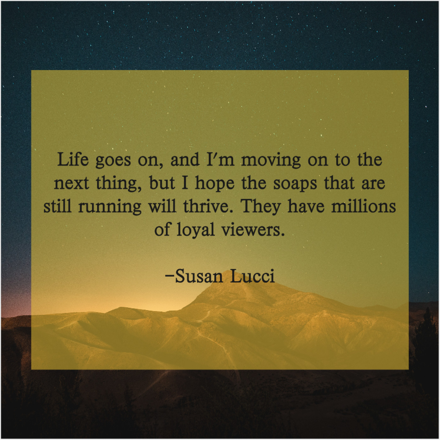 Susan Lucci Susan Lucci – Life goes on, and I’m… March 14, 2019 admin “Life goes on, and I’m moving on to the next thing, but I hope the soaps that are still running will thrive. They have millions of loyal viewers.”-Susan Lucci