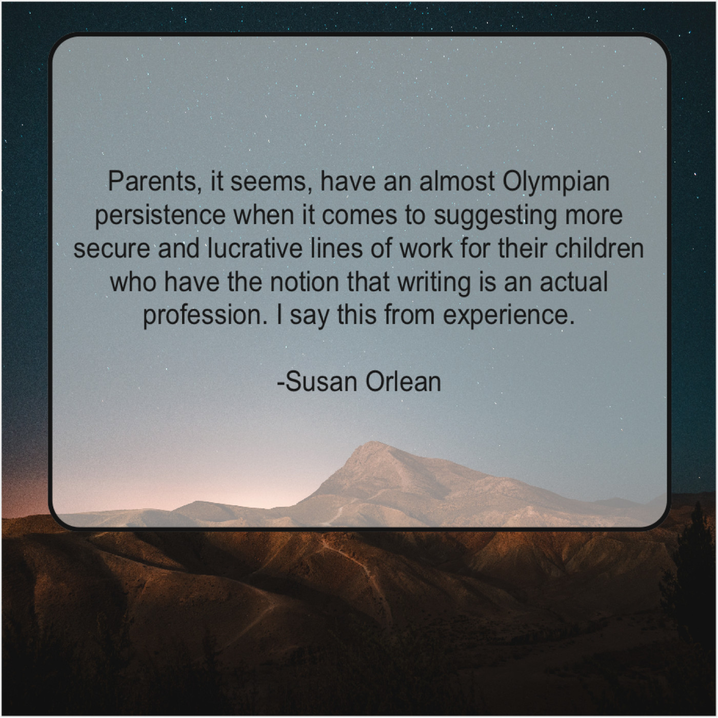 Susan Orlean Susan Orlean – Parents, it seems, have an… August 26, 2019 admin “Parents, it seems, have an almost Olympian persistence when it comes to suggesting more secure and lucrative lines of work for their children who have the notion that writing is an actual profession. I say this from experience.”-Susan Orlean