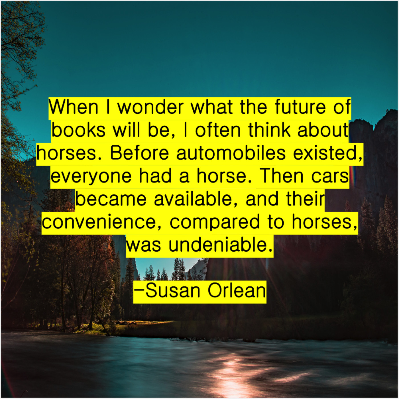 Susan Orlean Susan Orlean – When I wonder what the… July 23, 2019 admin “When I wonder what the future of books will be, I often think about horses. Before automobiles existed, everyone had a horse. Then cars became available, and their convenience, compared to horses, was undeniable.”-Susan Orlean