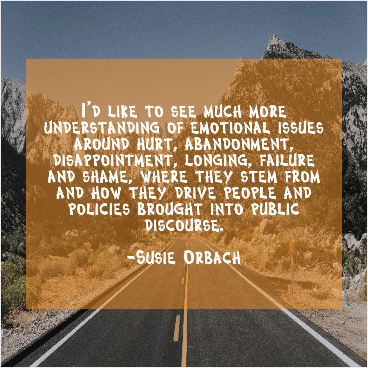 Susie Orbach Susie Orbach – I’d like to see much… January 4, 2019 admin “I’d like to see much more understanding of emotional issues around hurt, abandonment, disappointment, longing, failure and shame, where they stem from and how they drive people and policies brought into public discourse.”-Susie Orbach