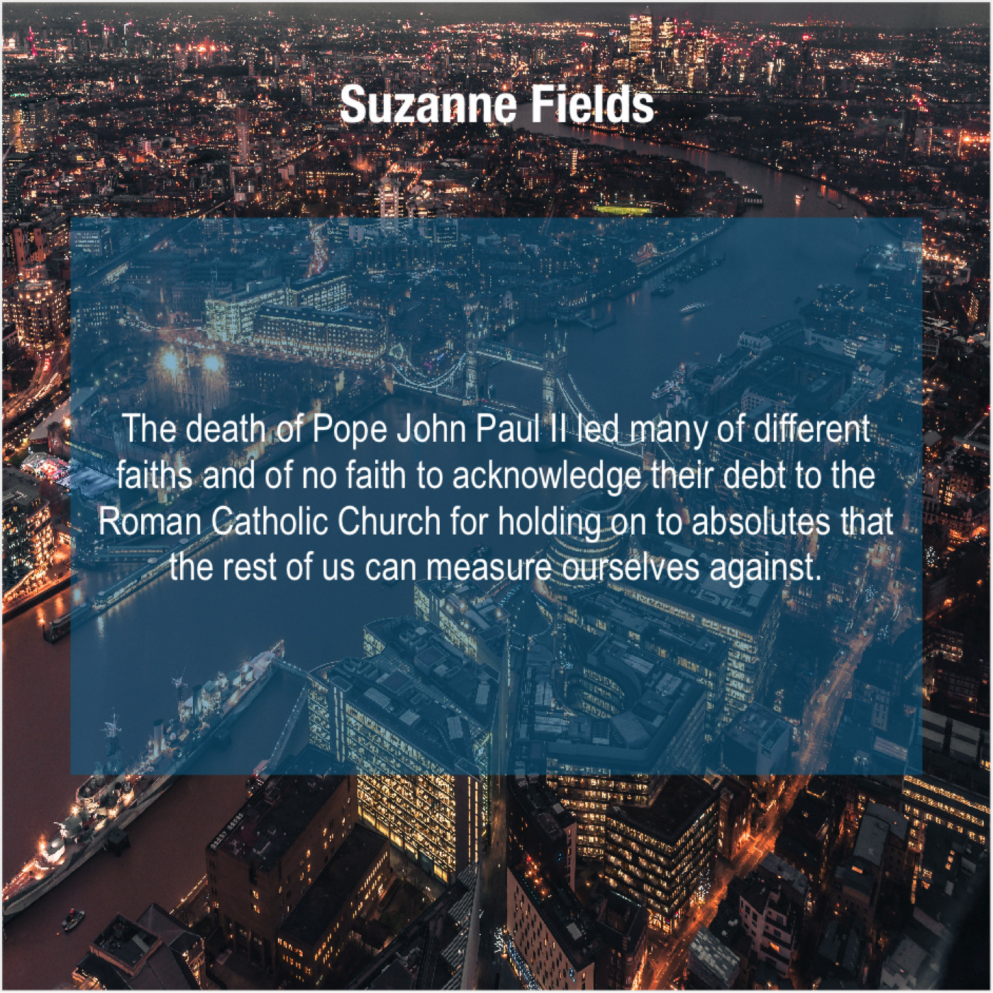 Suzanne Fields Suzanne Fields – The death of Pope John… September 10, 2019 admin “The death of Pope John Paul II led many of different faiths and of no faith to acknowledge their debt to the Roman Catholic Church for holding on to absolutes that the rest of us can measure ourselves against.”-Suzanne Fields