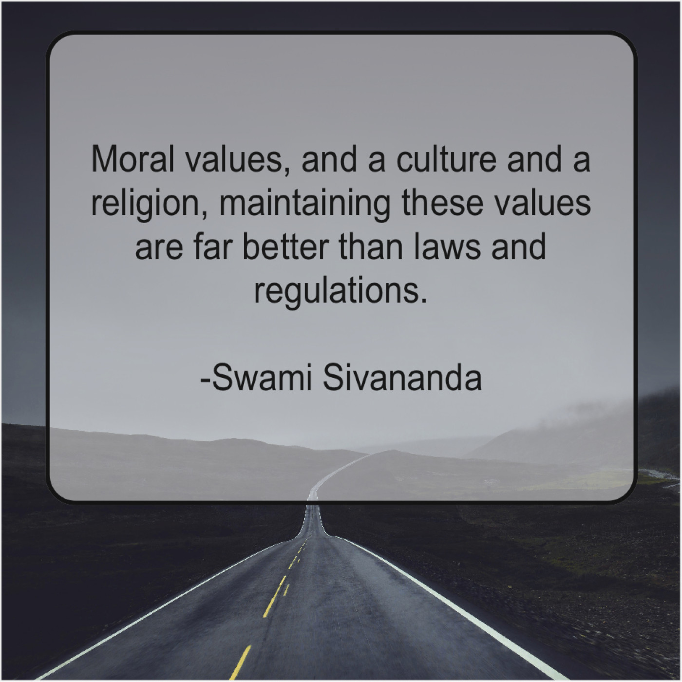 Swami Sivananda Swami Sivananda – Moral values, and a culture… August 15, 2019 admin “Moral values, and a culture and a religion, maintaining these values are far better than laws and regulations.”-Swami Sivananda