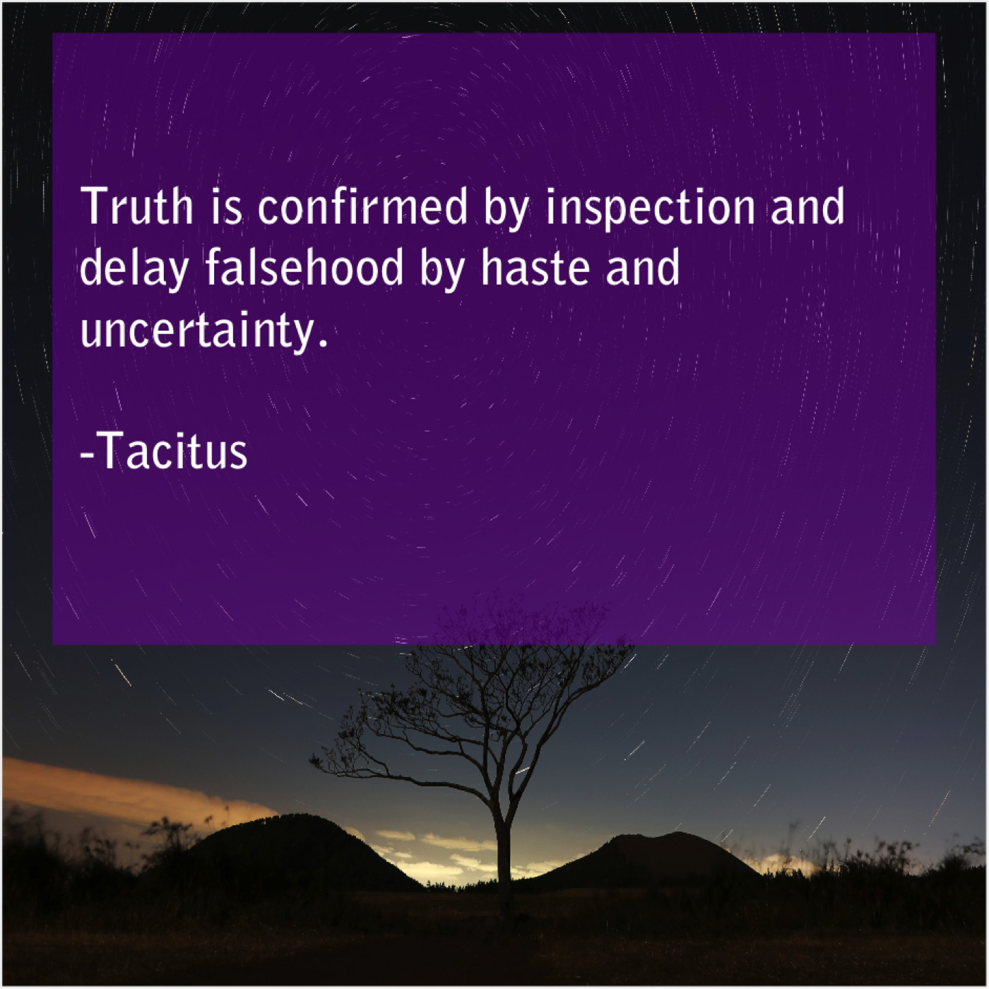 Tacitus Tacitus – Truth is confirmed by inspection… June 16, 2019 admin “Truth is confirmed by inspection and delay falsehood by haste and uncertainty.”-Tacitus