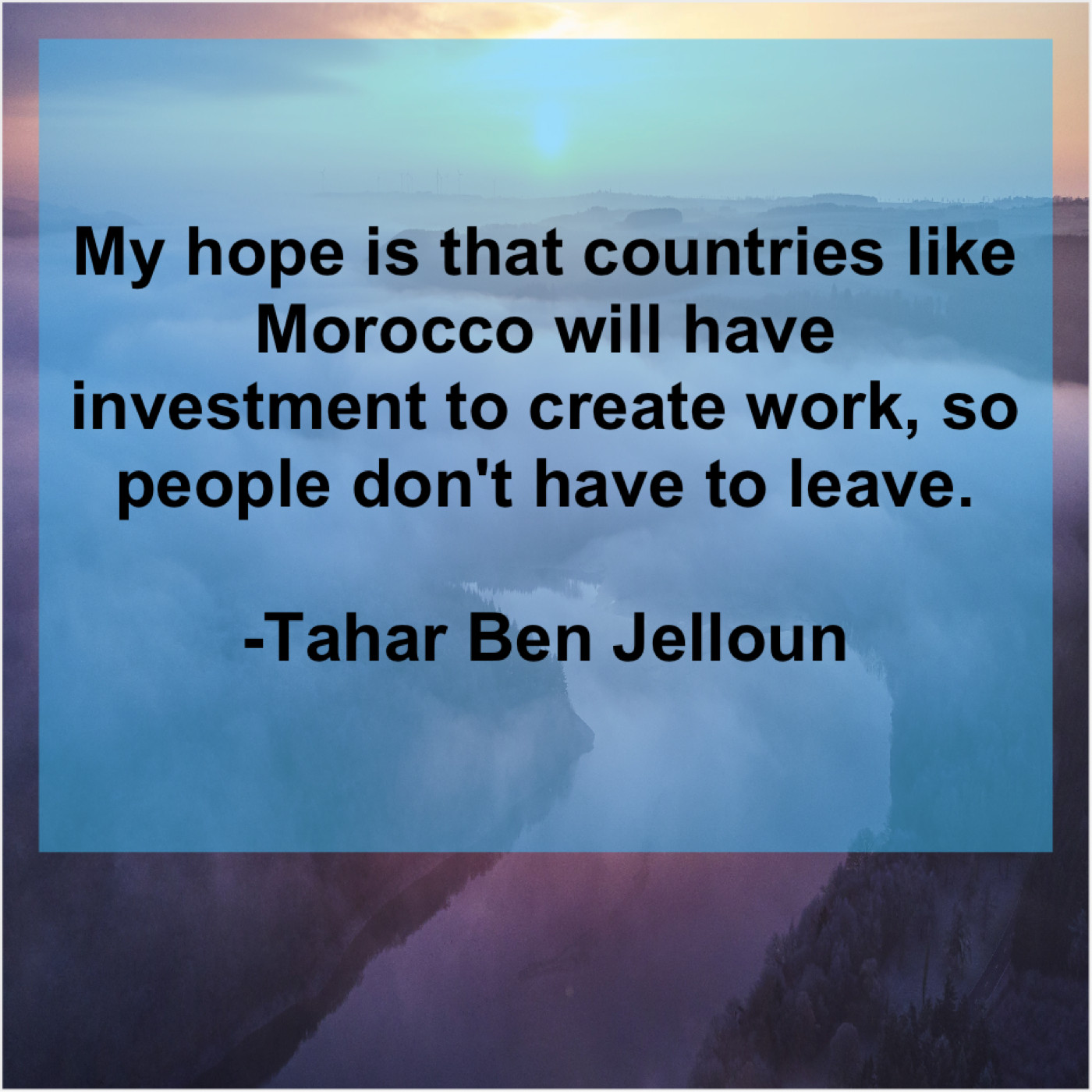 Tahar Ben Jelloun Tahar Ben Jelloun – My hope is that countries… March 19, 2019 admin “My hope is that countries like Morocco will have investment to create work, so people don’t have to leave.”-Tahar Ben Jelloun