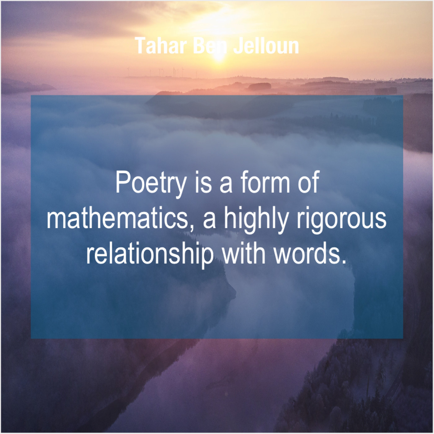 Tahar Ben Jelloun Tahar Ben Jelloun – Poetry is a form of… January 22, 2019 admin “Poetry is a form of mathematics, a highly rigorous relationship with words.”-Tahar Ben Jelloun