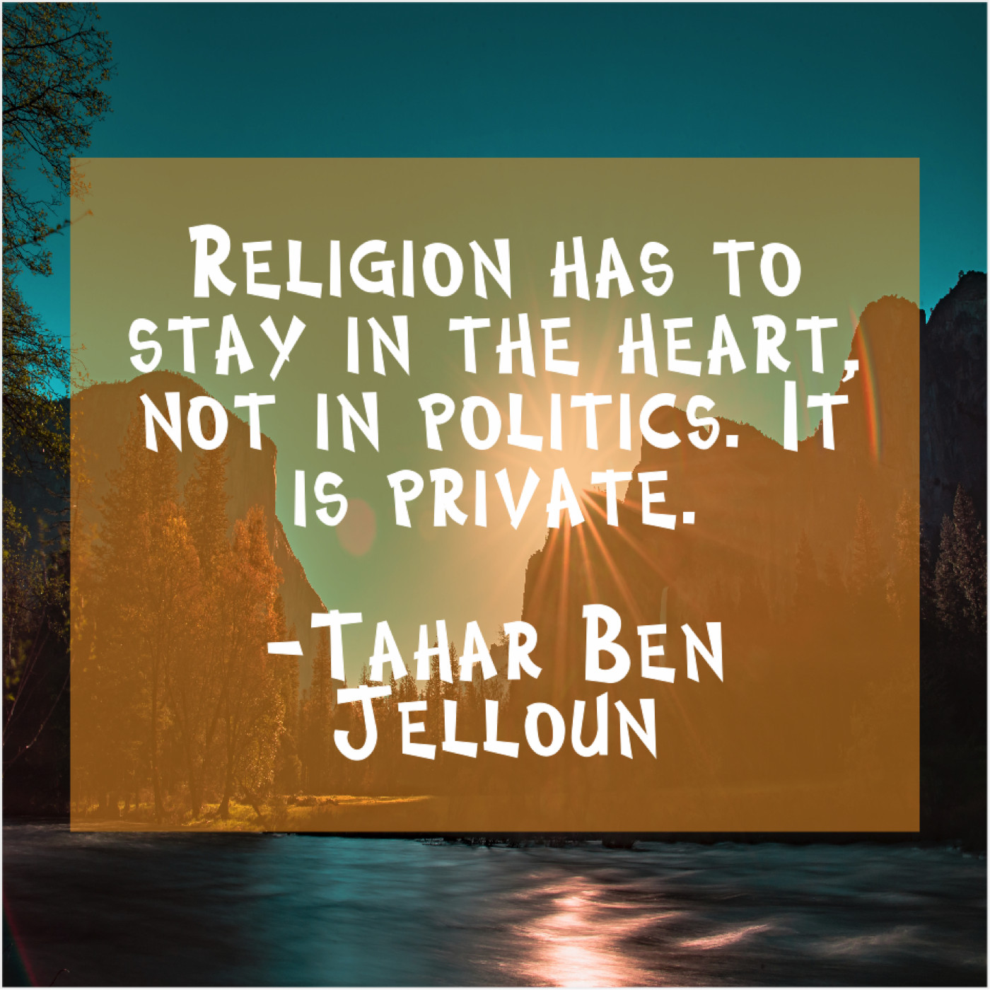 Tahar Ben Jelloun Tahar Ben Jelloun – Religion has to stay in… May 29, 2019 admin “Religion has to stay in the heart, not in politics. It is private.”-Tahar Ben Jelloun