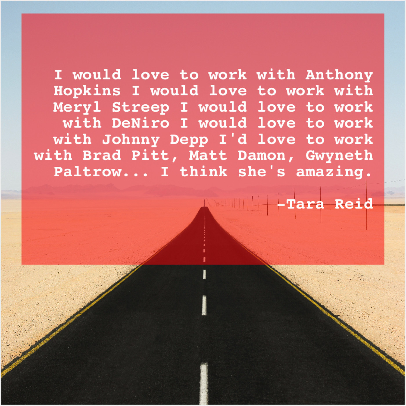 Tara Reid Tara Reid – I would love to work… November 2, 2018 admin “I would love to work with Anthony Hopkins I would love to work with Meryl Streep I would love to work with DeNiro I would love to work with Johnny Depp I’d love to work with Brad Pitt, Matt Damon, Gwyneth Paltrow… I think she’s amazing.”-Tara Reid