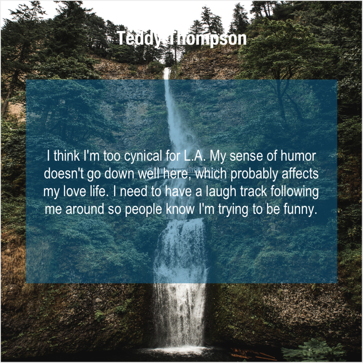 Teddy Thompson Teddy Thompson – I think I’m too cynical… October 14, 2019 admin “I think I’m too cynical for L.A. My sense of humor doesn’t go down well here, which probably affects my love life. I need to have a laugh track following me around so people know I’m trying to be funny.”-Teddy Thompson