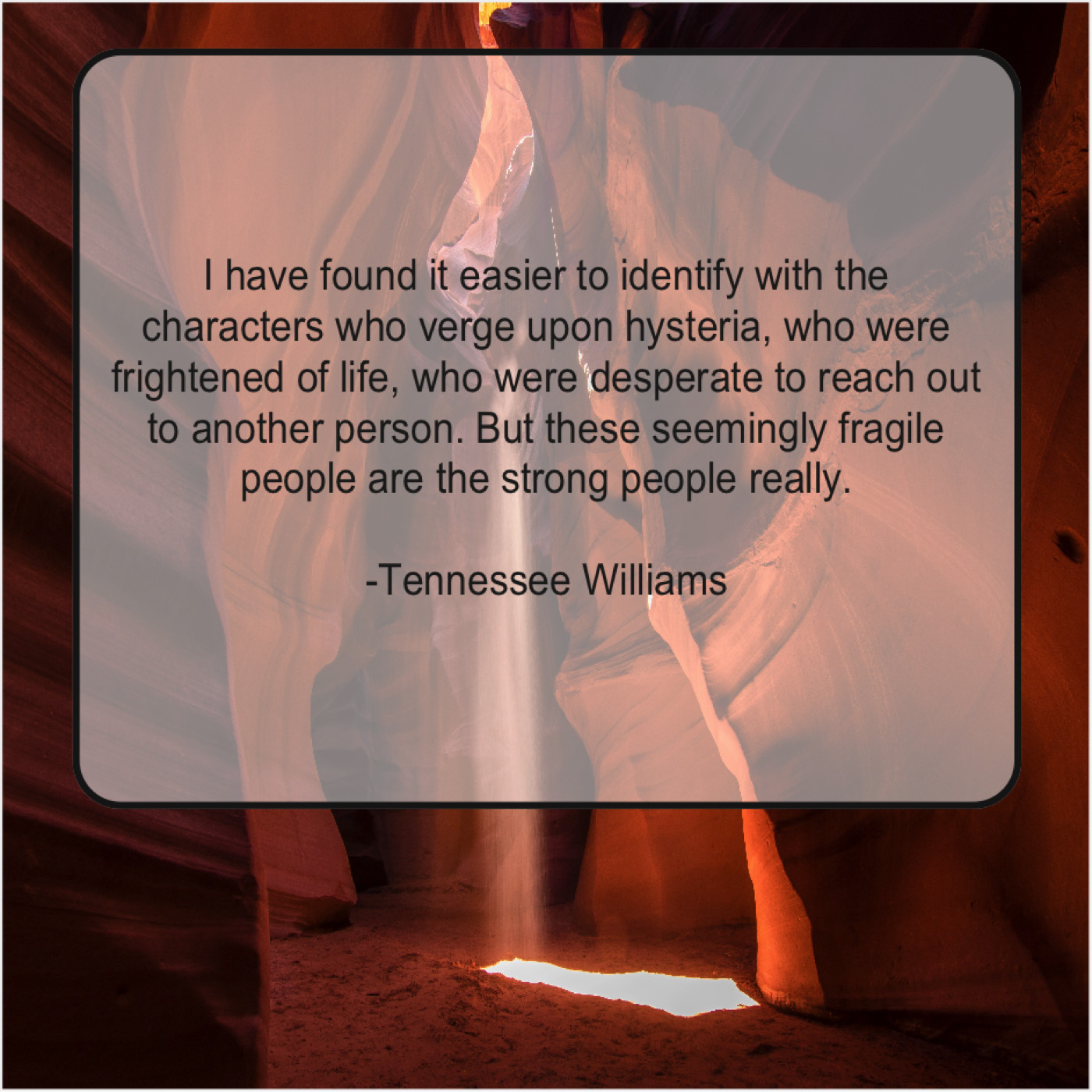Tennessee Williams Tennessee Williams – I have found it easier… October 3, 2019 admin “I have found it easier to identify with the characters who verge upon hysteria, who were frightened of life, who were desperate to reach out to another person. But these seemingly fragile people are the strong people really.”-Tennessee Williams