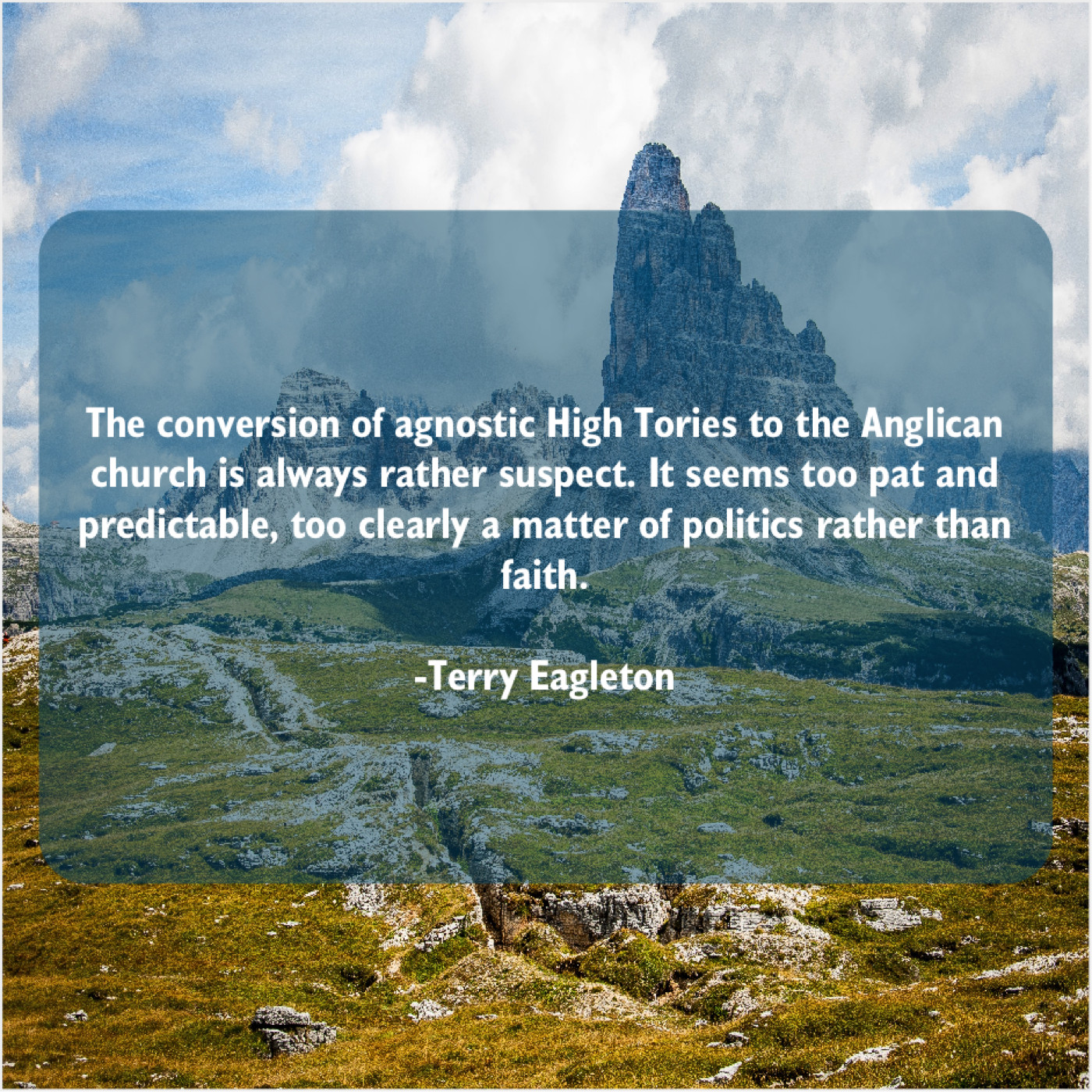 Terry Eagleton Terry Eagleton – The conversion of agnostic High… February 9, 2019 admin “The conversion of agnostic High Tories to the Anglican church is always rather suspect. It seems too pat and predictable, too clearly a matter of politics rather than faith.”-Terry Eagleton