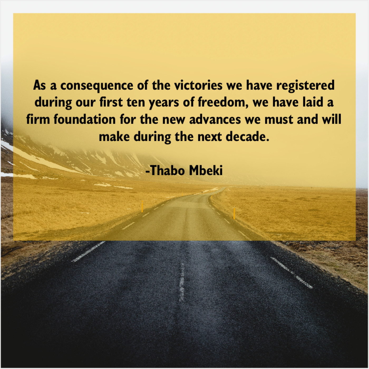 Thabo Mbeki Thabo Mbeki – As a consequence of the… December 14, 2018 admin “As a consequence of the victories we have registered during our first ten years of freedom, we have laid a firm foundation for the new advances we must and will make during the next decade.”-Thabo Mbeki
